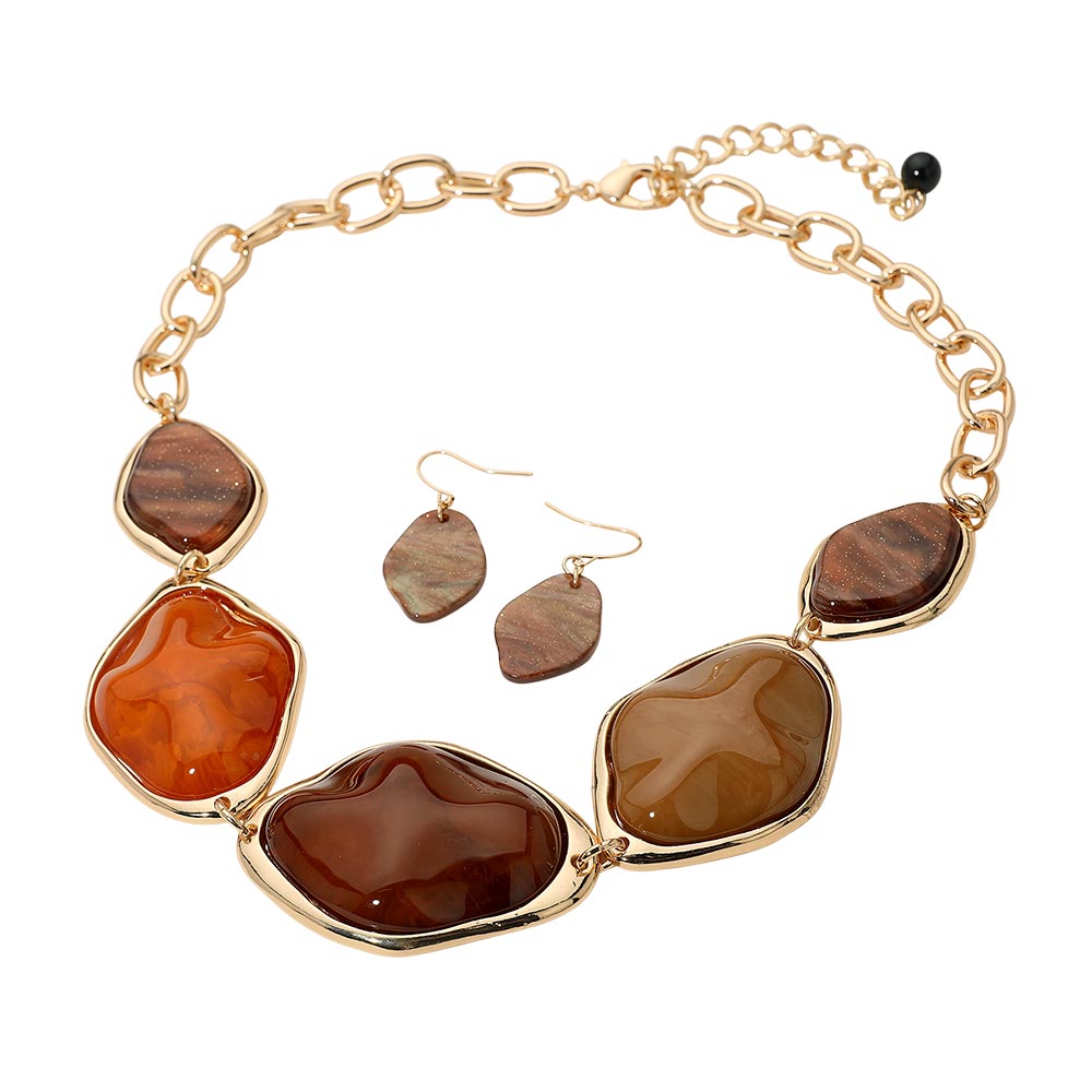 • This chunky gem statement necklace and earring set features an artistic organic design with sculpted, polished stones framed in elegant settings. Perfect for bold, confident style, it adds warmth and sophistication to any outfit, ideal for special occasions or evening wear.