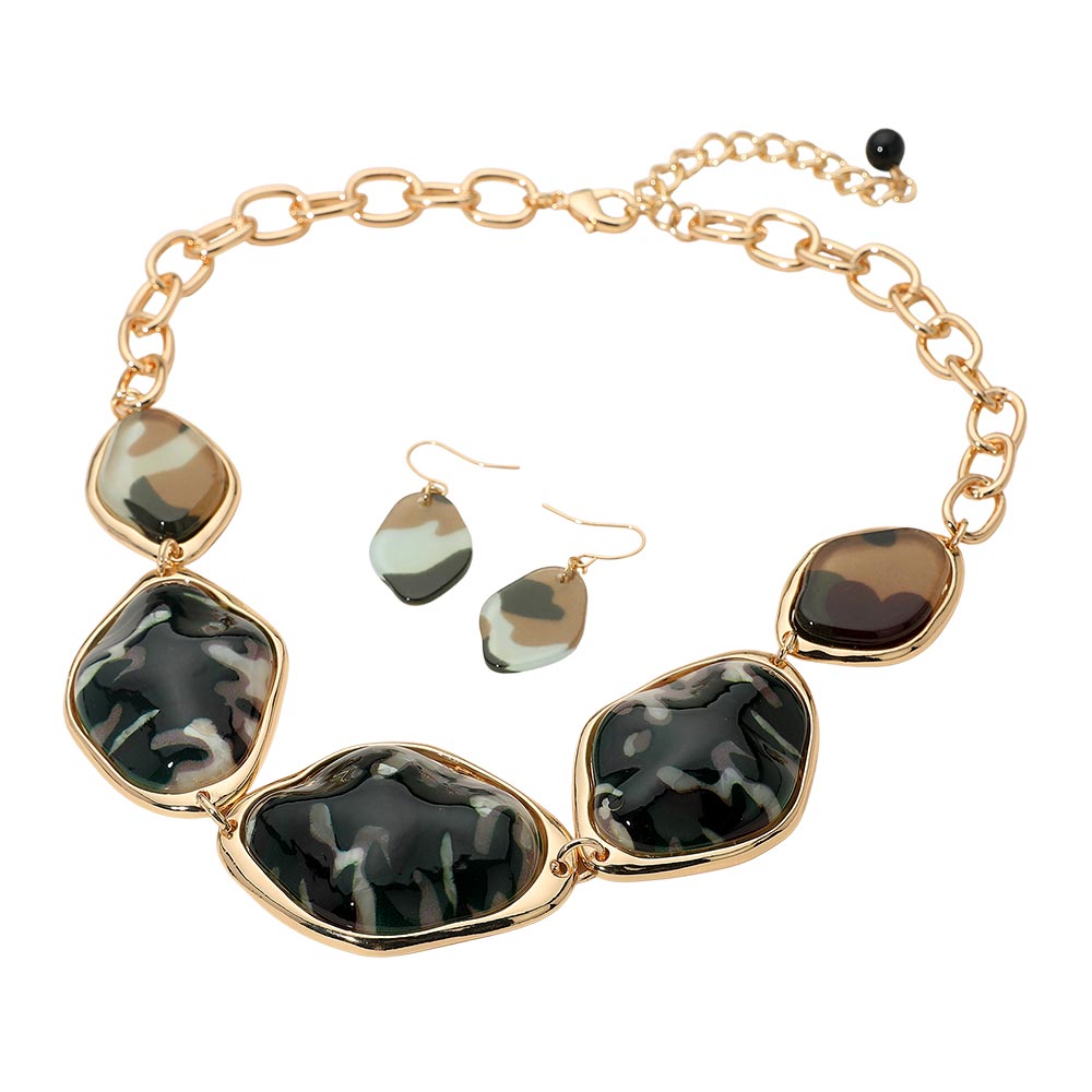 • This chunky gem statement necklace and earring set features an artistic organic design with sculpted, polished stones framed in elegant settings. Perfect for bold, confident style, it adds warmth and sophistication to any outfit, ideal for special occasions or evening wear.