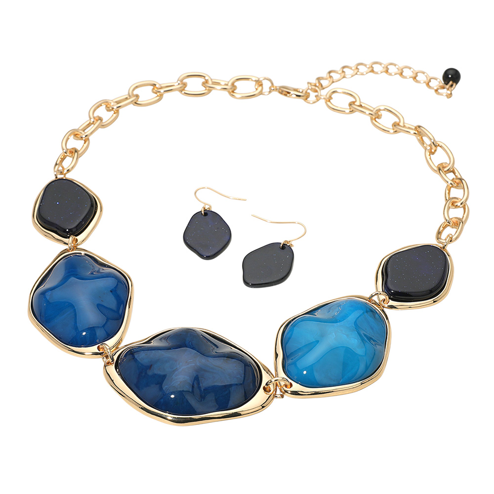 • This chunky gem statement necklace and earring set features an artistic organic design with sculpted, polished stones framed in elegant settings. Perfect for bold, confident style, it adds warmth and sophistication to any outfit, ideal for special occasions or evening wear.
