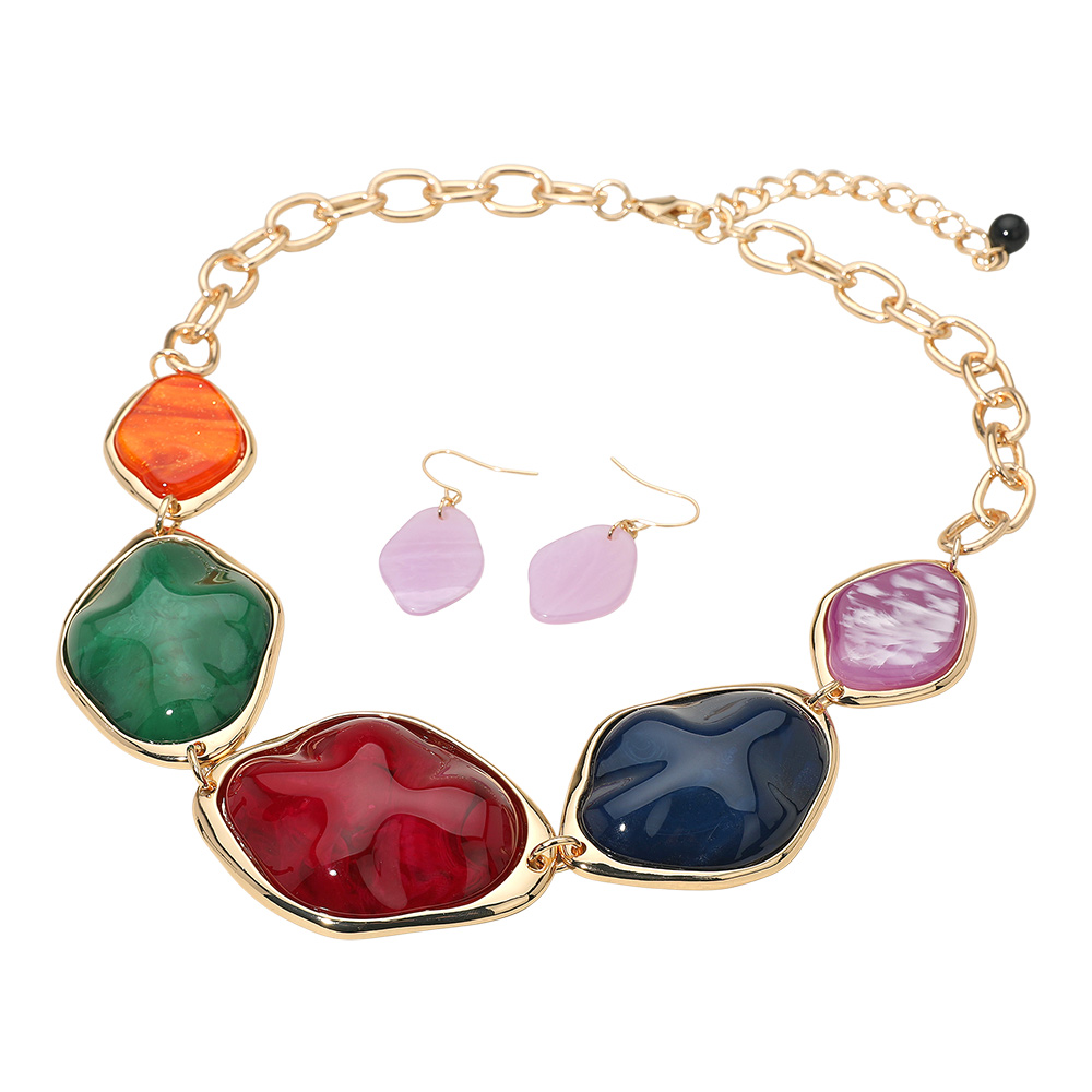 • This chunky gem statement necklace and earring set features an artistic organic design with sculpted, polished stones framed in elegant settings. Perfect for bold, confident style, it adds warmth and sophistication to any outfit, ideal for special occasions or evening wear.