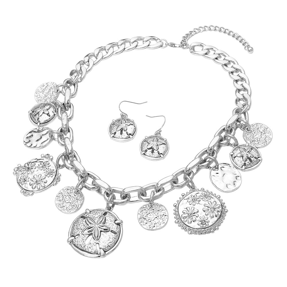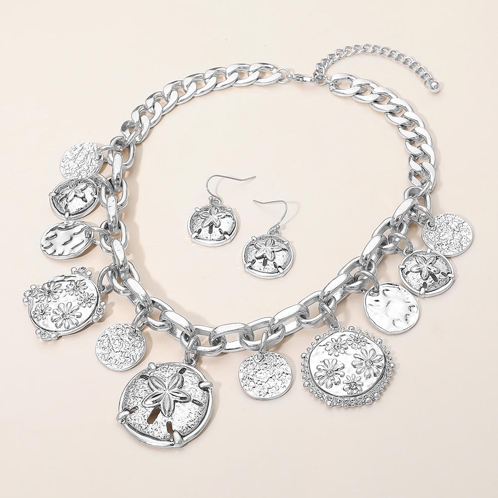 • Statement necklace and earring set featuring a bold chain adorned with engraved medallion charms for an artistic, textured look. Perfect for elevating casual or dressy outfits, this coordinated set offers unique detailing and versatile style, making it ideal for gifting or adding flair to your collection.