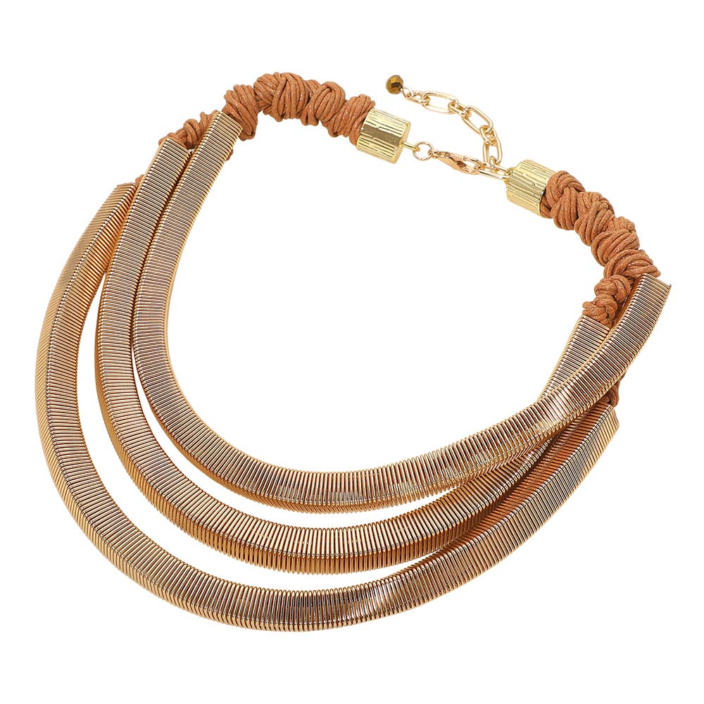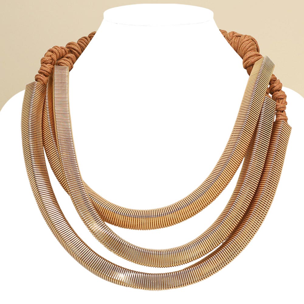 Details • Necklace Size : 20" + 3" L • Decor Size : 2.5" L • Striking layered statement necklace featuring multiple curved strands and structured cord detailing for a bold yet wearable silhouette. Designed to add dimension and modern edge to any outfit, this eye-catching piece is ideal for boutiques seeking elevated statement jewelry that transitions seamlessly from casual styling to dressed-up looks. • Lead and Nickel Compliant
