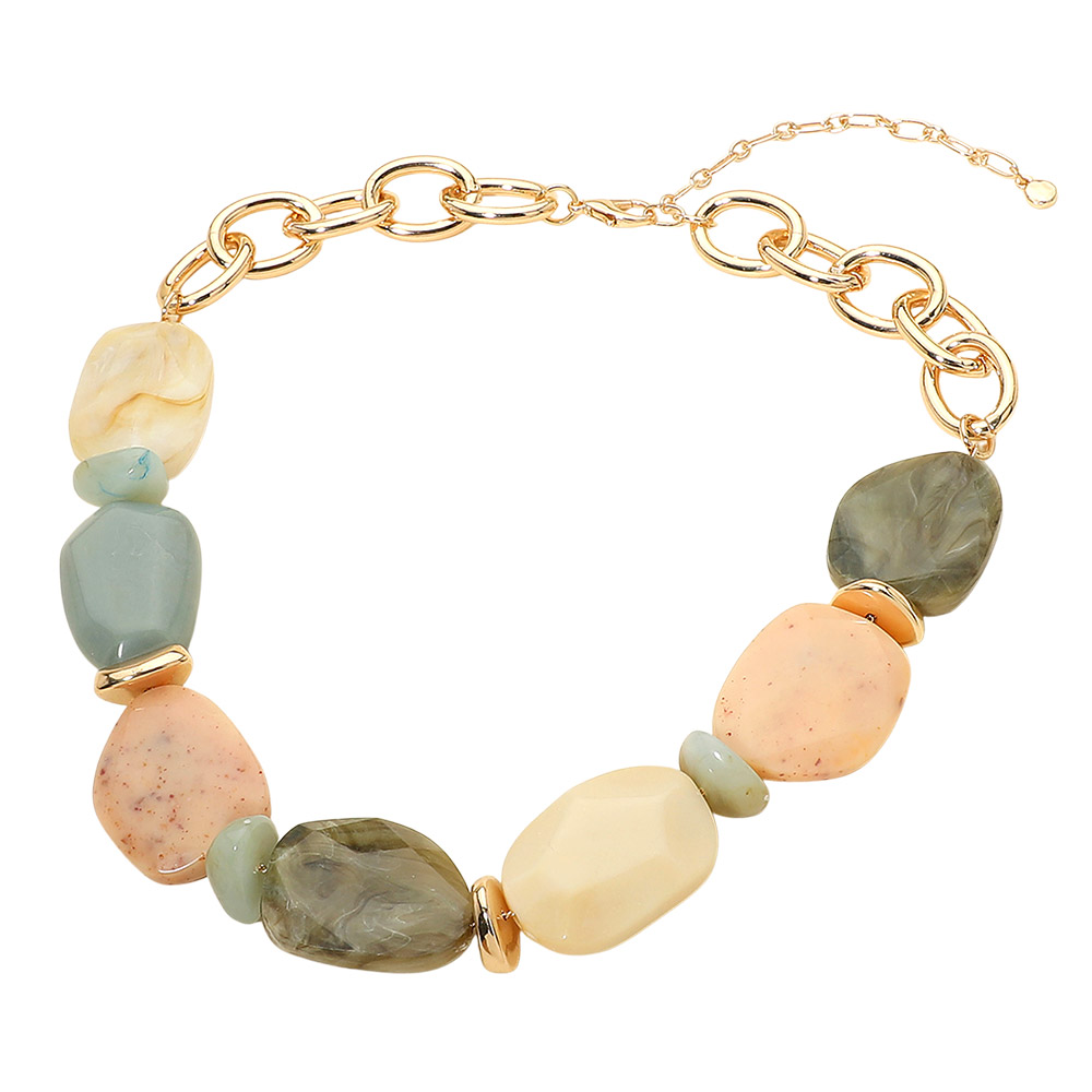 Details • Necklace Size : 16" + 3" L • Decor Size : 0.9" L • Statement necklace featuring organically shaped beads paired with bold chain accents for a modern, sculptural look. Designed with an adjustable length for flexible styling, this piece adds depth and visual interest to everyday outfits, resort wear, or elevated casual ensembles. • Lead and Nickel Compliant