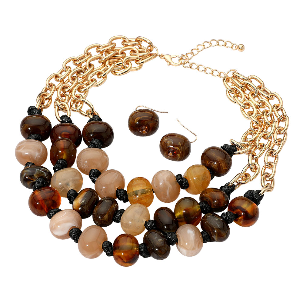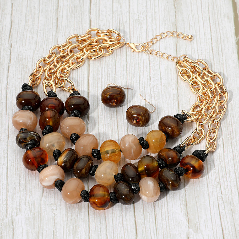Details • Necklace Size : 15.5" + 3" L • Decor Size : 2.5" L • Earrings Size : 1.5" L • Stylish layered chain and beaded necklace set paired with matching earrings for a chic coordinated look. Designed to add elegance and flair to both casual and dressy outfits, this eye-catching set makes a standout addition to any jewelry collection. • Lead and Nickel Compliant