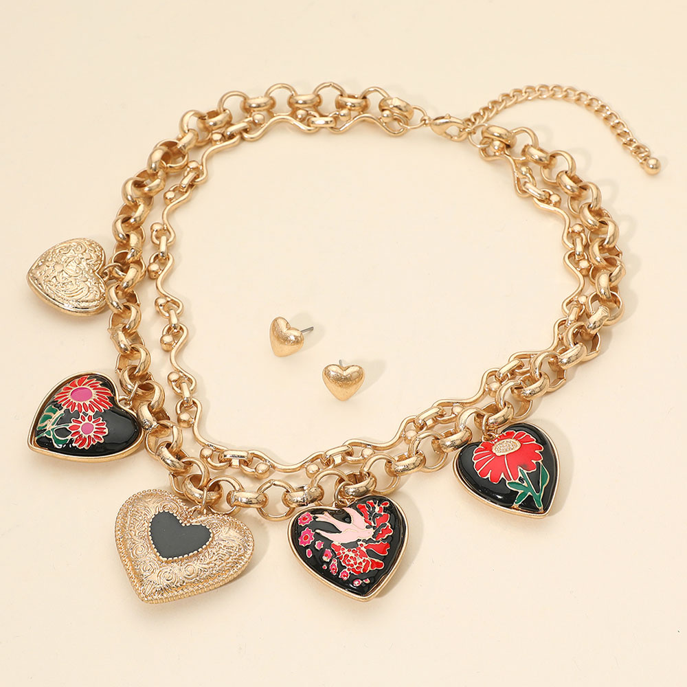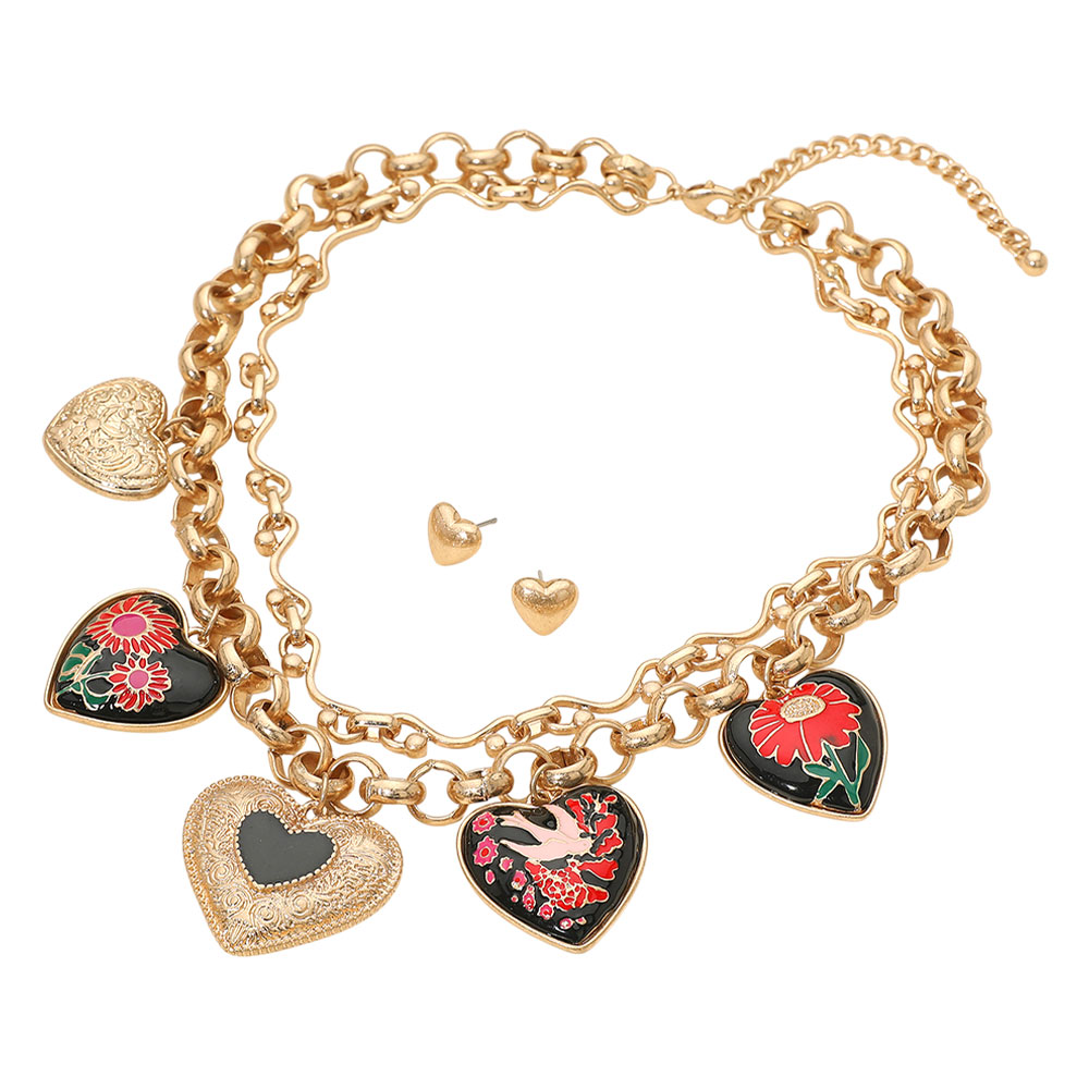 Details • Necklace Size : 17" + 4" L • Decor Size : 3.2" L • Earrings Size : 0.5" L • Charming chain necklace set featuring multiple heart-shaped charms with mixed motif designs, paired with matching stud earrings. A playful, expressive accessory perfect for gifting, themed outfits or adding artistic personality to everyday style. A standout, story-inspired set. • Lead and Nickel Compliant