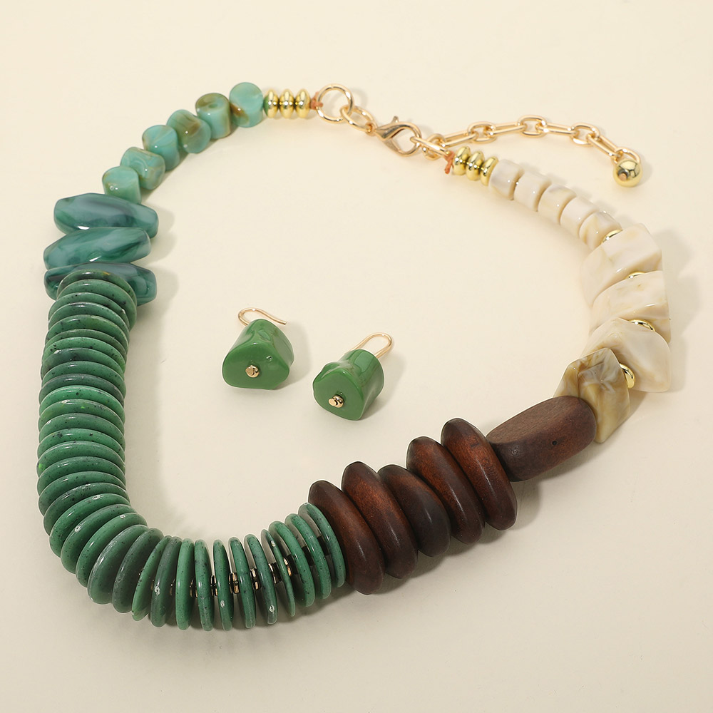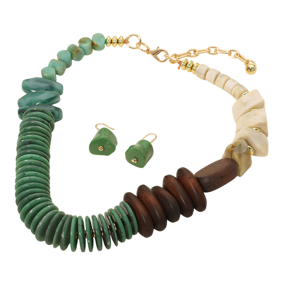 • Statement necklace and matching earring set featuring bold, mixed bead shapes arranged in a balanced, eye-catching design. This coordinated set delivers a modern statement look that elevates casual outfits and resort-inspired styling. Ideal for boutiques seeking unique, fashion-forward jewelry sets that add texture, dimension, and visual impact to curated accessory collections.