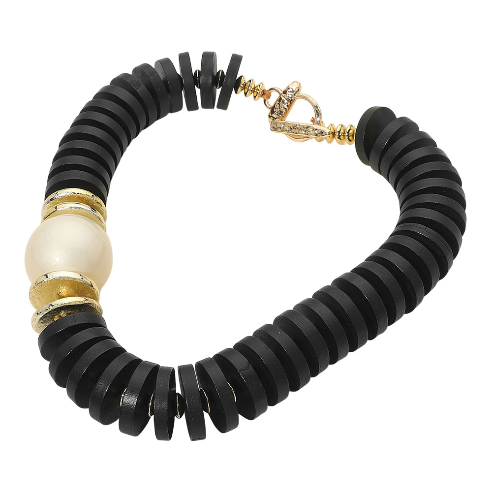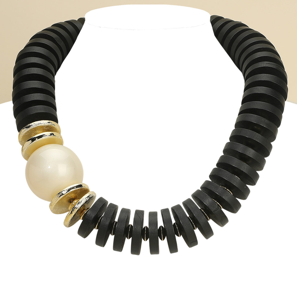Details • Necklace Size : 22" + 1" L • Decor Size : 1.5" L • Bold statement necklace featuring stacked disc beads and a sculptural focal accent for a modern, high-impact look. Designed to add structure and dimension to any outfit, this piece works effortlessly for everyday styling or elevated occasions. A standout accessory ideal for boutiques seeking fashion-forward, trend-driven statement jewelry. • Lead and Nickel Compliant