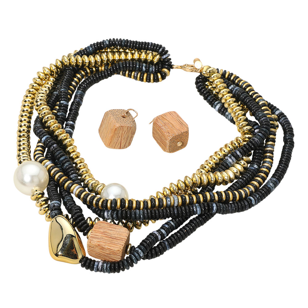 Chunky Pearl Wooden Cube Metal Pebble Accent Multi Disc Beaded Layered Toggle Statement Necklace