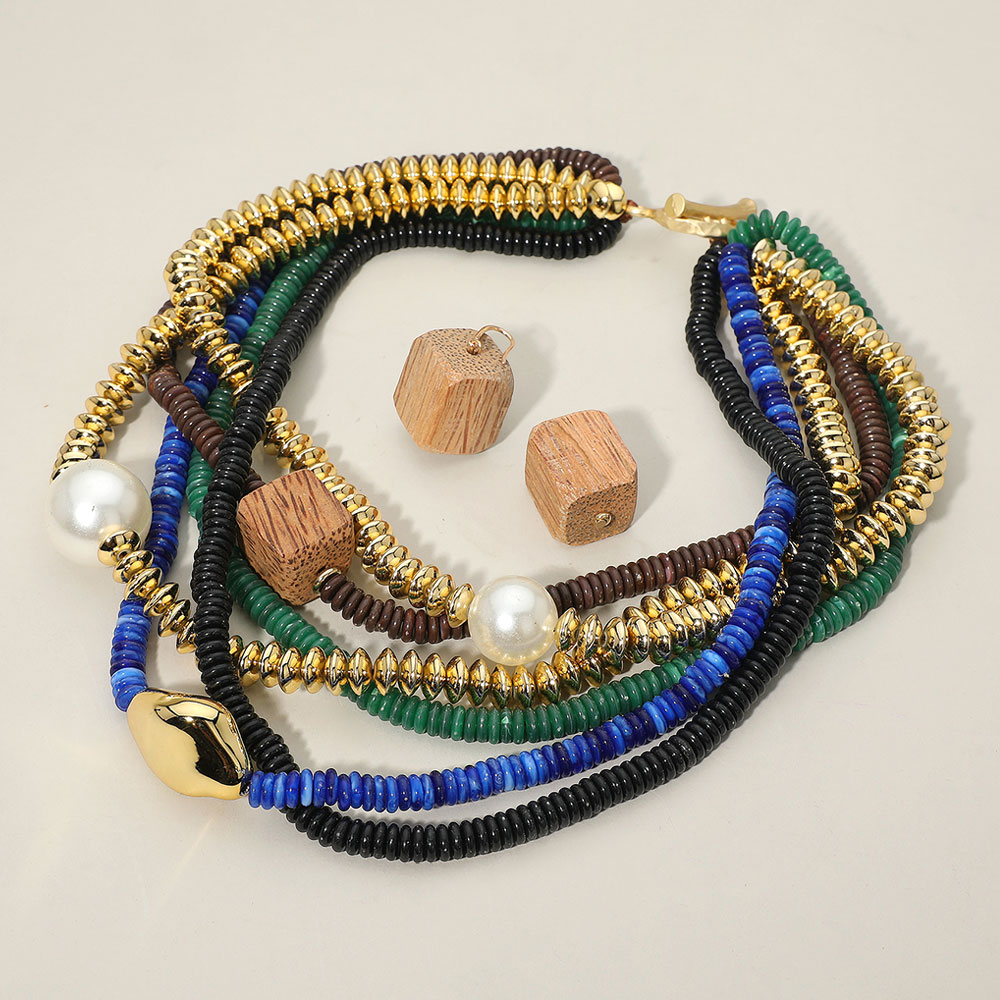 Chunky Pearl Wooden Cube Metal Pebble Accent Multi Disc Beaded Layered Toggle Statement Necklace