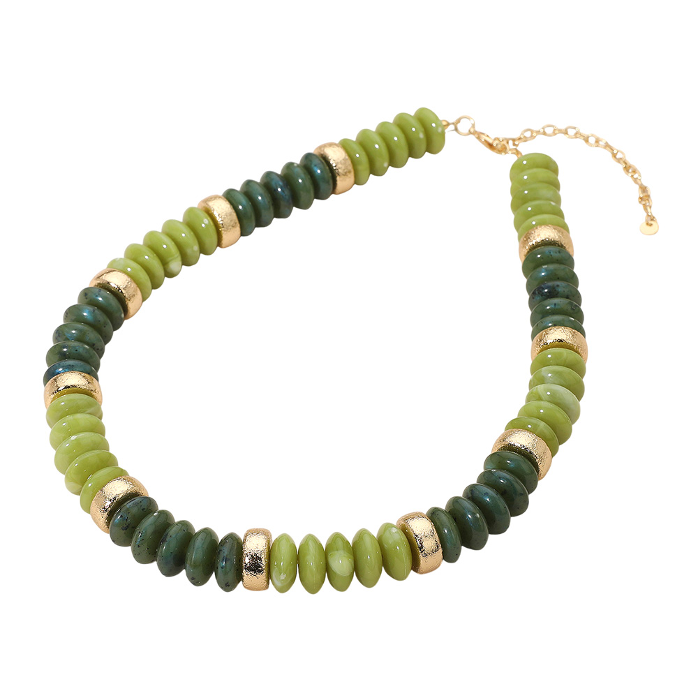 • Bold and contemporary, this chunky beaded necklace features smooth disc-shaped beads with metallic gold-tone spacers. A versatile statement piece that elevates any outfit with its sleek, modern design.