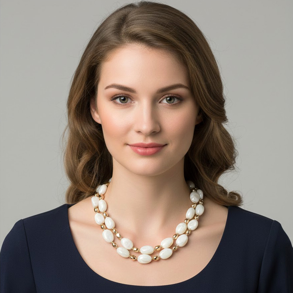• Stylish layered necklace featuring smooth oval beads paired with polished accent details for a dimensional, eye-catching look. Designed to sit beautifully at the neckline, this statement piece adds depth and elegance to everyday outfits, workwear, or elevated styling while remaining easy to layer or wear on its own.