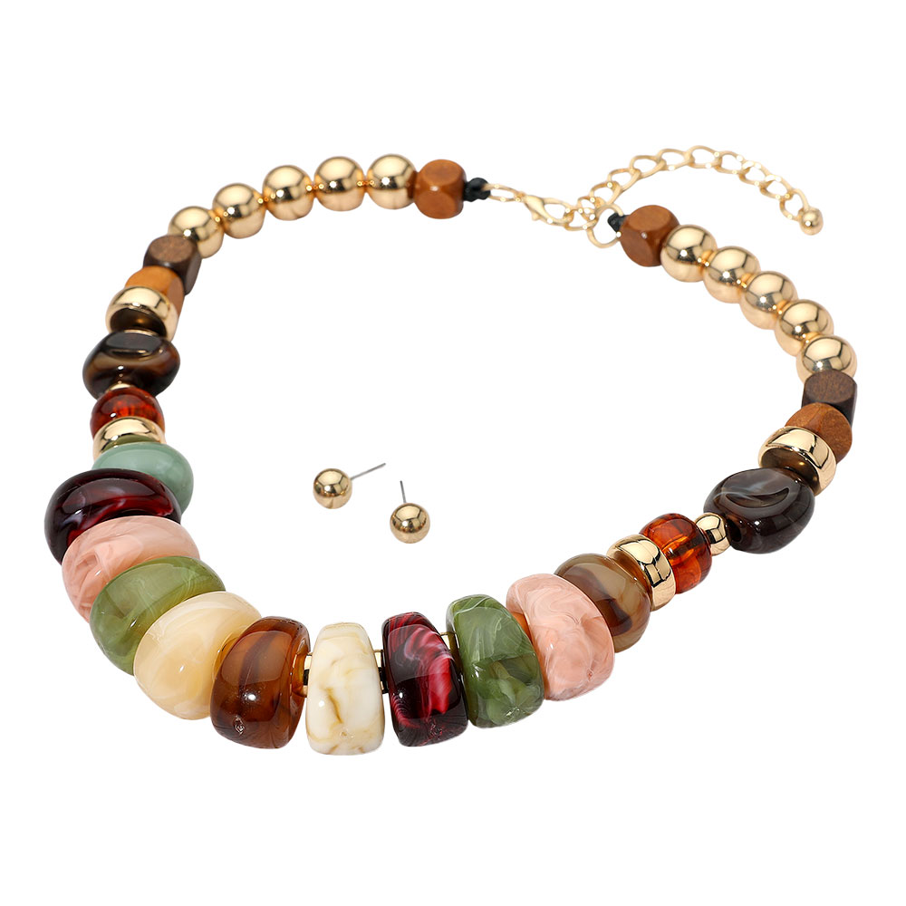 Chunky Resin Pebble Wooden Beaded Statement Necklace