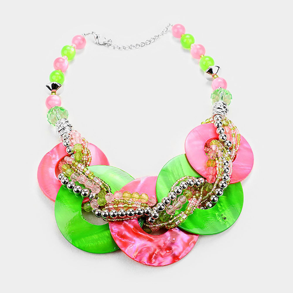 Details • Necklace Size : 17" + 3" L • Decor Size : 2.25" L • Earring Size : 1.5" L • Make a bold impression with this layered beaded statement necklace and matching earrings set. Designed with oversized circular accents and mixed bead strands, it adds vibrant energy and artistic flair to any outfit, perfect for elevating casual or evening looks effortlessly. • Lead and Nickel Compliant