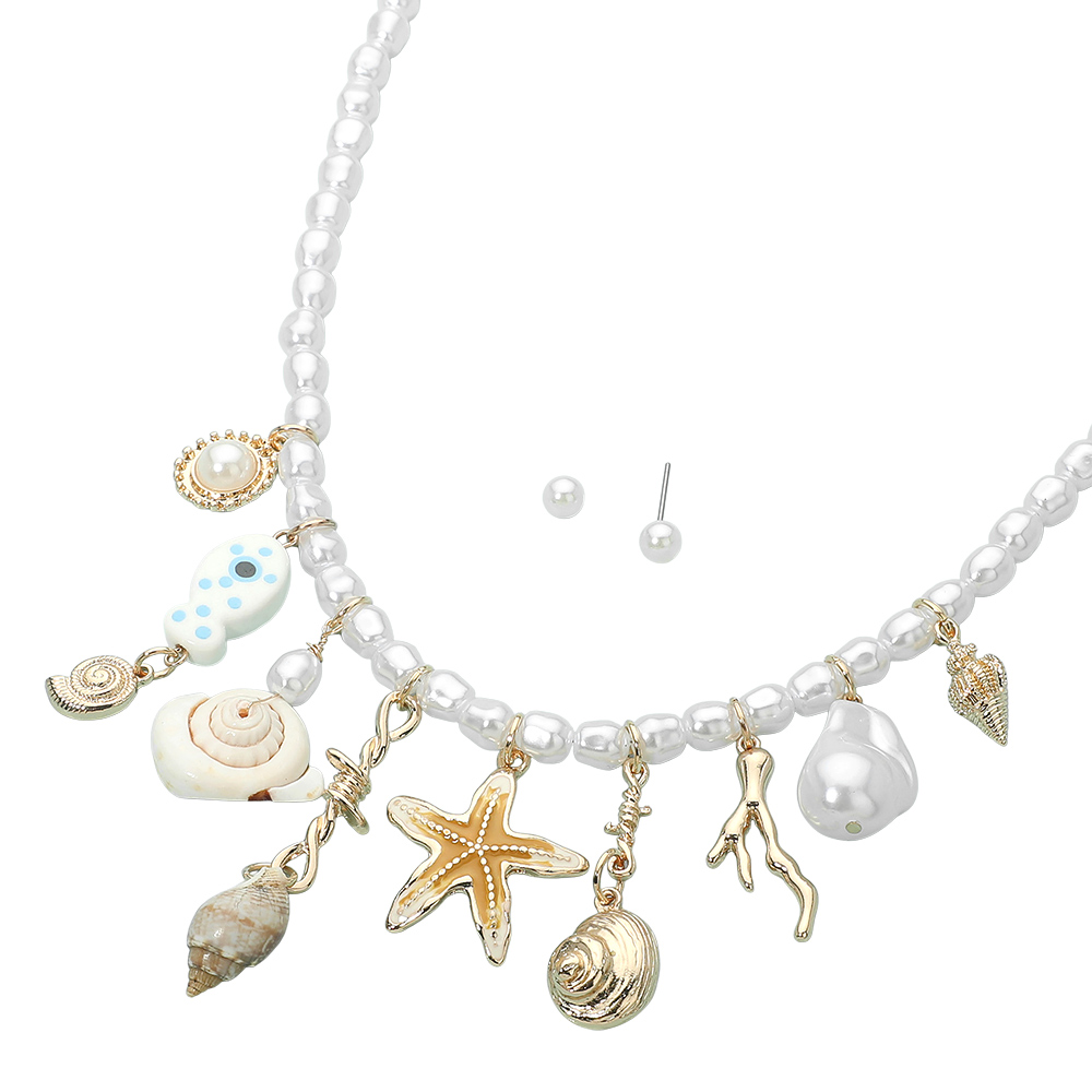 Details • Necklace Size : 17" + 3.25" L • Decor Size : 2.25" L • Earrings Size : 0.2" L • Playful charm necklace and stud earring set featuring bead-style accents and a mix of seaside-inspired motifs arranged for movement and layered interest. Designed to add personality to everyday outfits, vacation looks, and casual styling, this set delivers standout appeal for boutique accessory collections. • Lead and Nickel Compliant