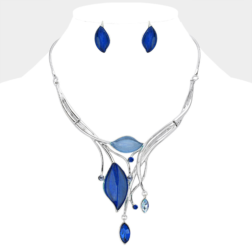 • Elegant leaf pendant necklace with matching earrings featuring sleek metallic accents and delicate leaf shapes. This jewelry set adds a refined and feminine touch, perfect for formal occasions or stylish everyday wear.