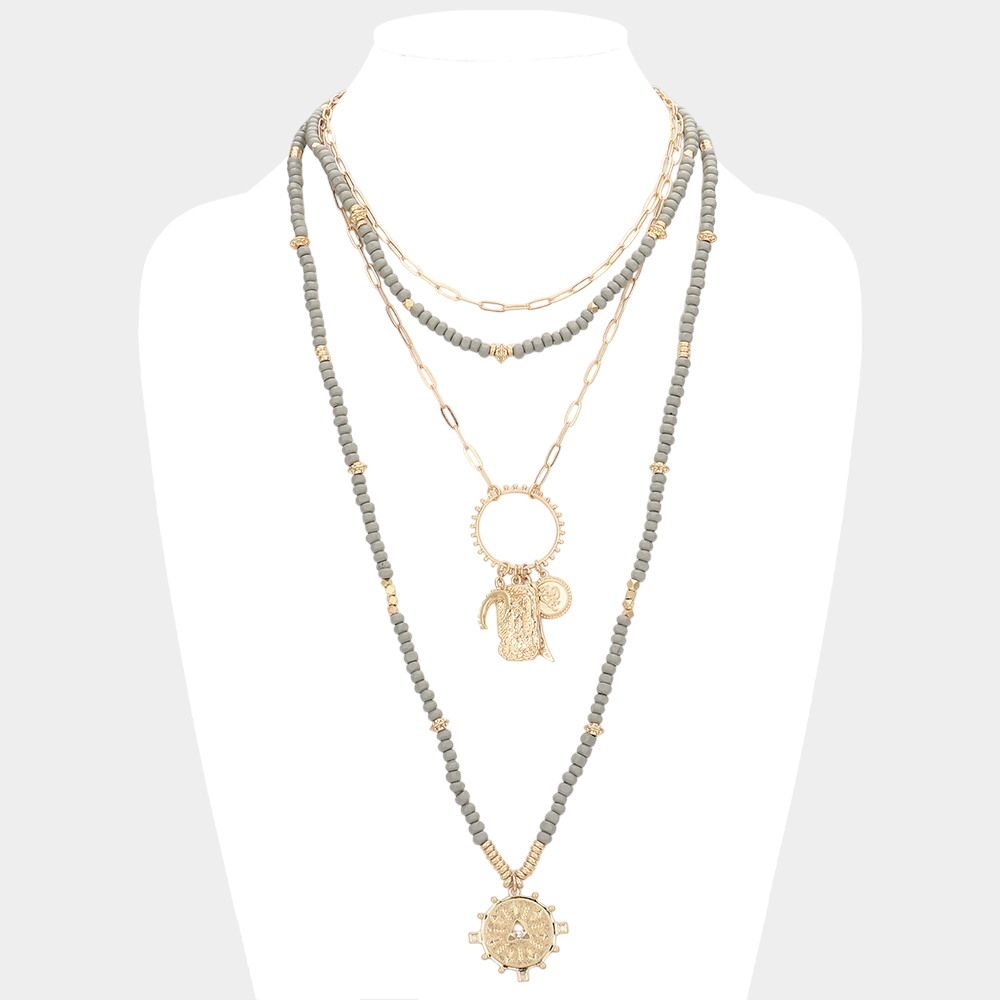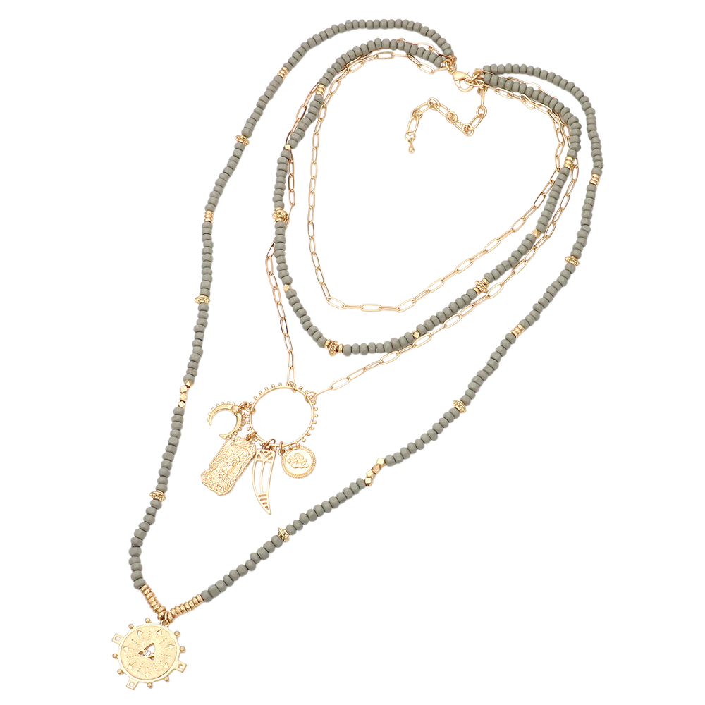 Double Horn Evil Eye Centered Pendant Wood Beaded Multi Layered Necklace