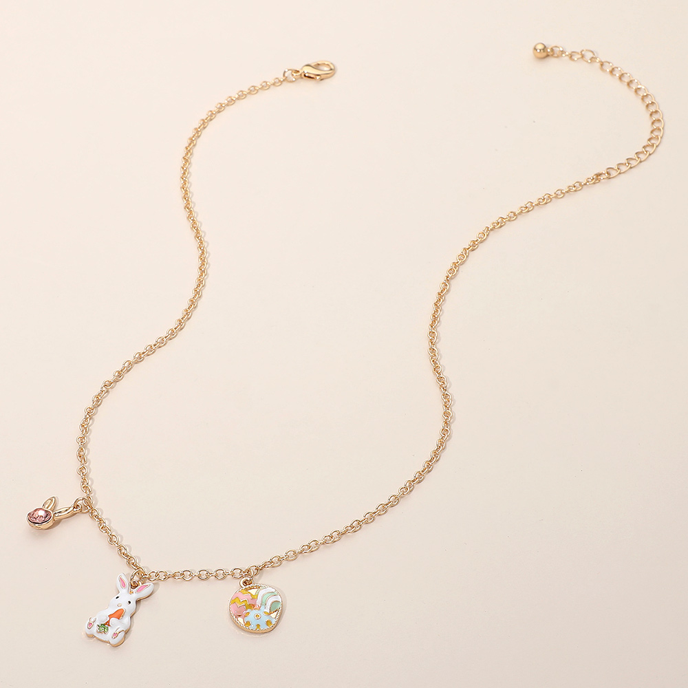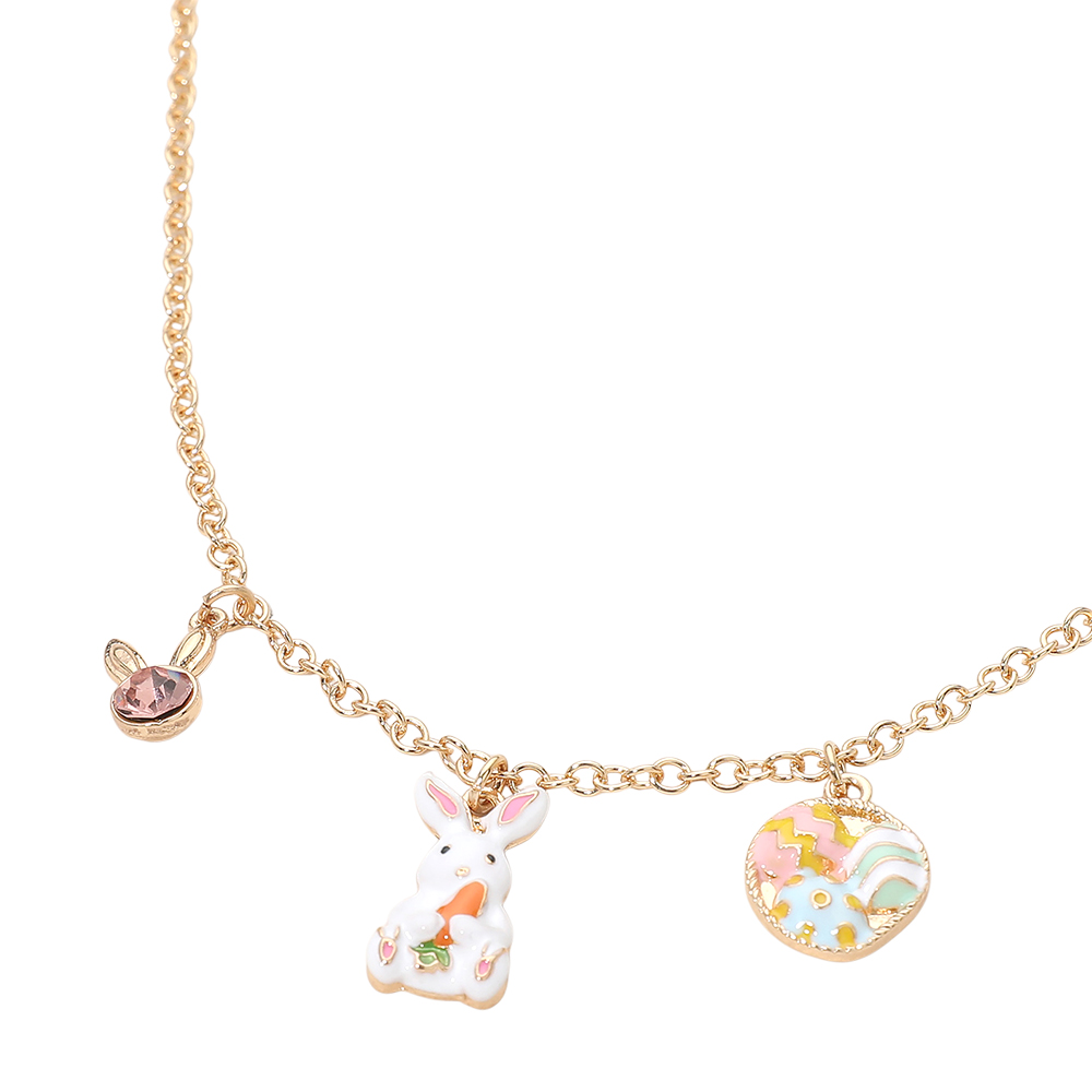 Details • Necklace Size : 18" + 3.25" L • Decor Size : 0.75" L • Easter bunny charm necklace featuring playful seasonal motifs designed to bring cheerful character to spring styling. A fun statement piece ideal for holiday outfits, gifting, or themed displays. Perfect for boutiques seeking festive jewelry that adds charm, personality, and seasonal appeal. • Lead and Nickel Compliant