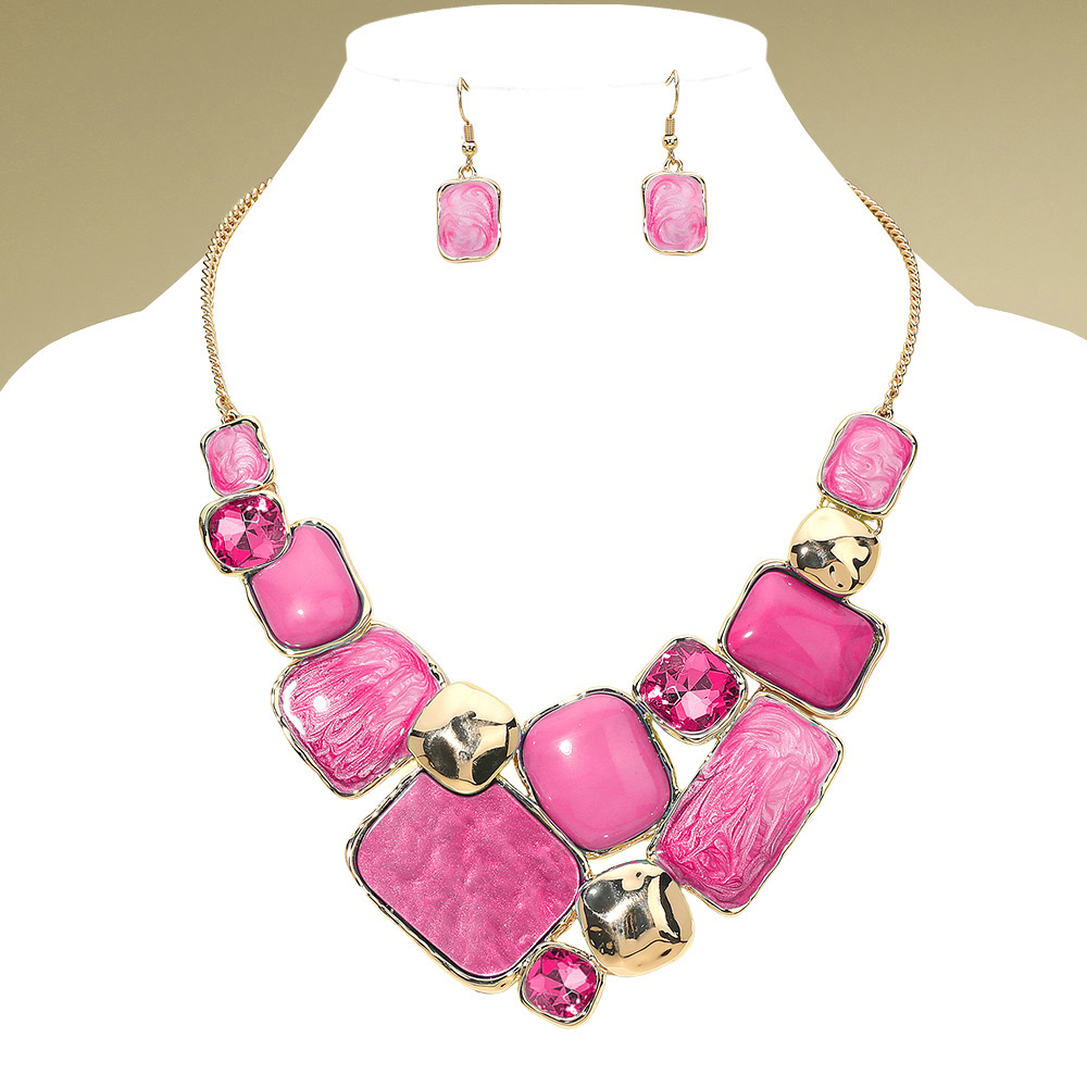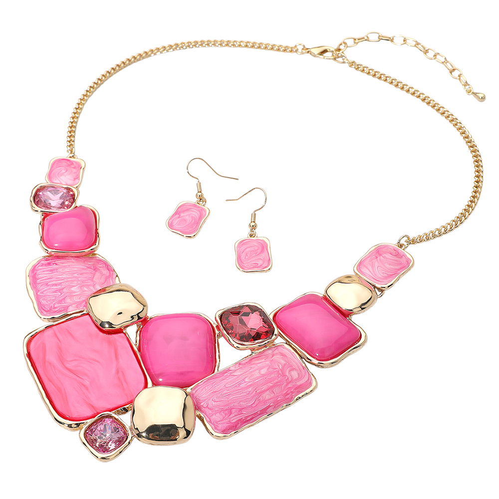 • Modern statement necklace and earrings set featuring a mosaic of enamel geometric plate accents framed in metallic trim. The bold mix of smooth and marbled textures adds artistic flair, making it a standout accessory for elegant or contemporary fashion ensembles.