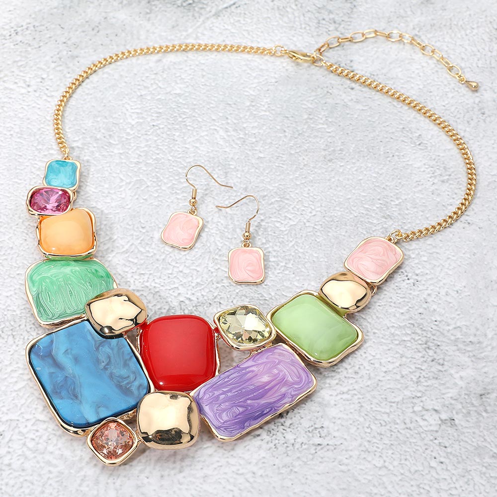 • Modern statement necklace and earrings set featuring a mosaic of enamel geometric plate accents framed in metallic trim. The bold mix of smooth and marbled textures adds artistic flair, making it a standout accessory for elegant or contemporary fashion ensembles.