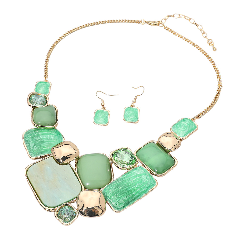 • Modern statement necklace and earrings set featuring a mosaic of enamel geometric plate accents framed in metallic trim. The bold mix of smooth and marbled textures adds artistic flair, making it a standout accessory for elegant or contemporary fashion ensembles.