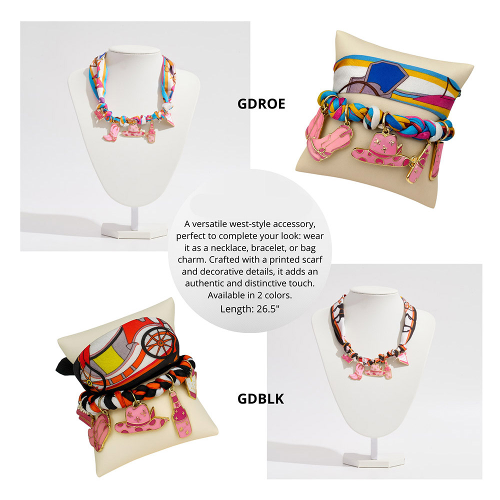 Details • Size : 26.5" L • Charm Size : 1.75" L • Print may vary • A versatile scarf accessory that transforms into a necklace, bracelet, or bag charm. Designed with a printed scarf and western-inspired charms, it brings authentic detail and unique style. Available in 2 bold designs, it adds a distinctive touch to any look. • Brass • Gold Dipped • Hypoallergenic • Lead and Nickel Compliant • Made In Korea