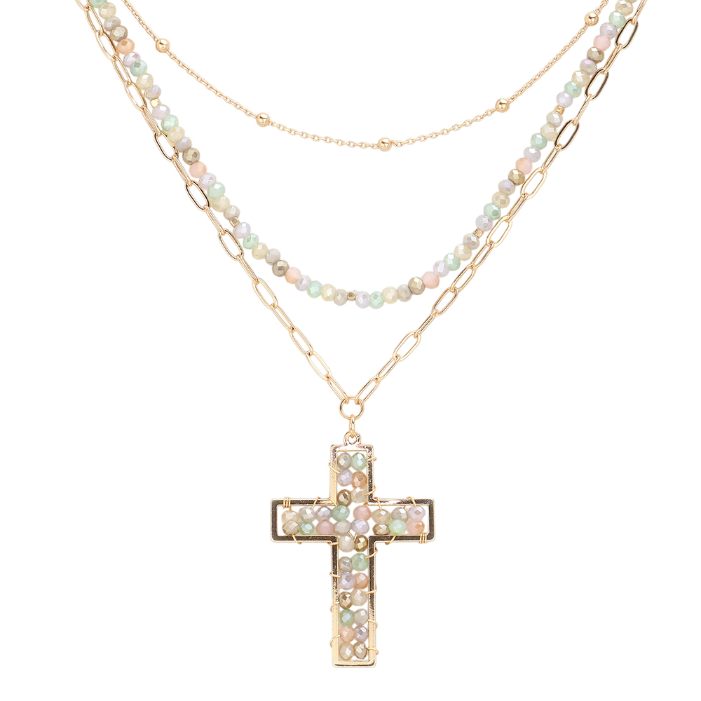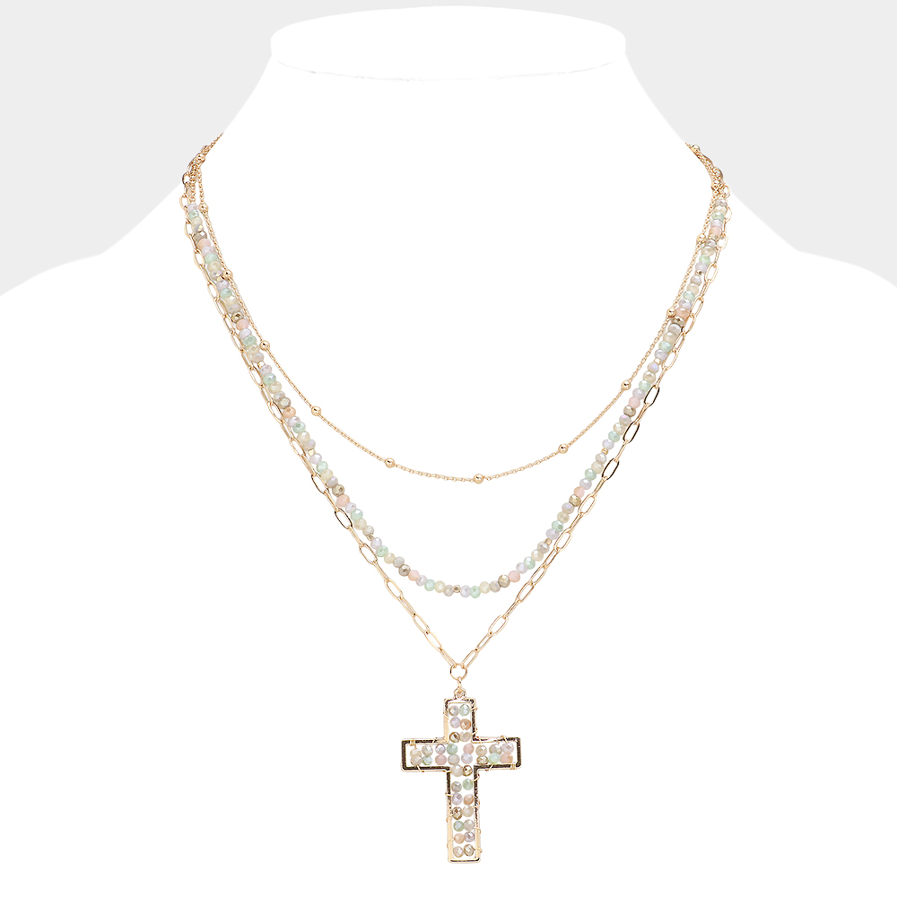 Faceted Beaded Metal Paperclip Chain Layered Cross Pendant Necklace