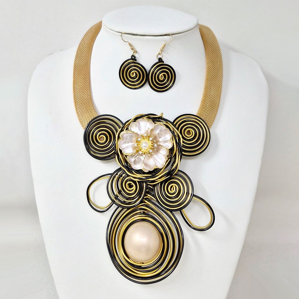 Details • Necklace Size : 18.5" + 3" L • Decor Size : 4.75" L • Earrings Size : 2" L • Make a dramatic impression with this floral spiral statement necklace and matching earrings. The bold spiral design and delicate flower centerpiece blend artistry and elegance, creating a captivating accessory set perfect for special occasions or standout fashion moments. • Lead and Nickel Compliant