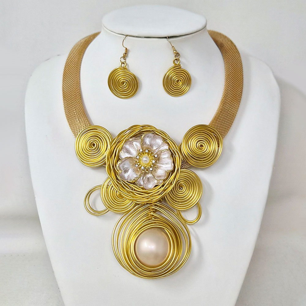 Details • Necklace Size : 18.5" + 3" L • Decor Size : 4.75" L • Earrings Size : 2" L • Make a dramatic impression with this floral spiral statement necklace and matching earrings. The bold spiral design and delicate flower centerpiece blend artistry and elegance, creating a captivating accessory set perfect for special occasions or standout fashion moments. • Lead and Nickel Compliant