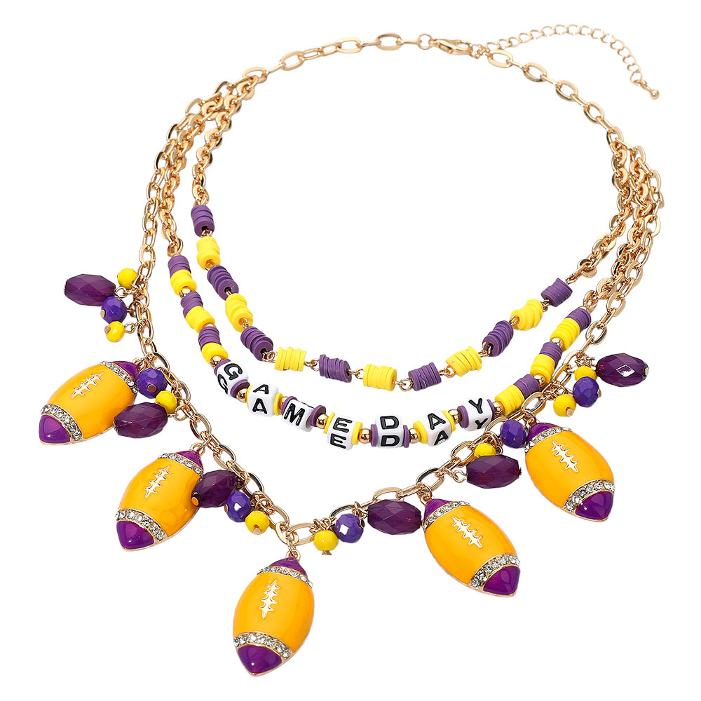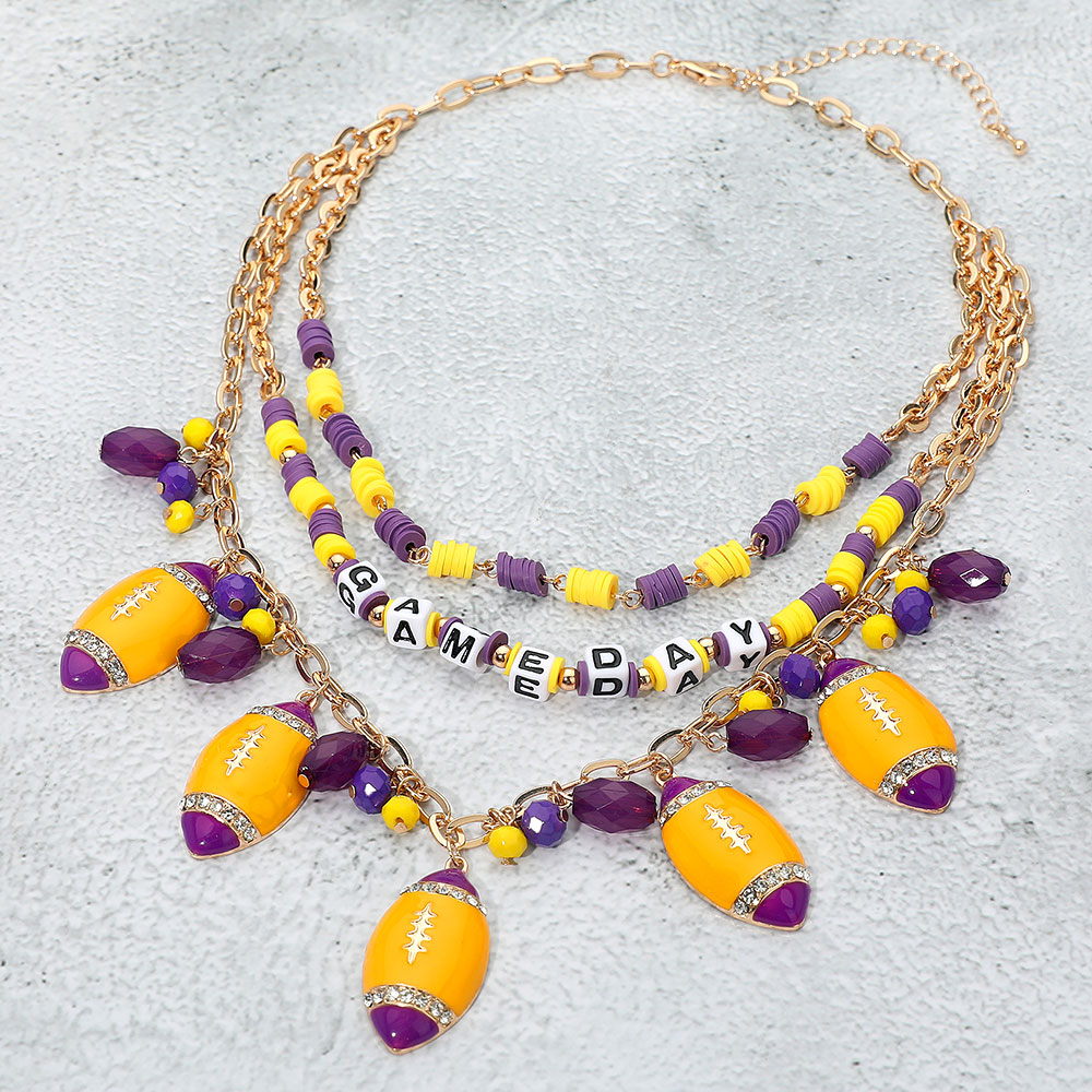 • Layered necklace featuring football charms, gameday letter beads, and playful accents. A spirited accessory to show team pride, add energy to gameday looks, and complete fan outfits with fun layered style.