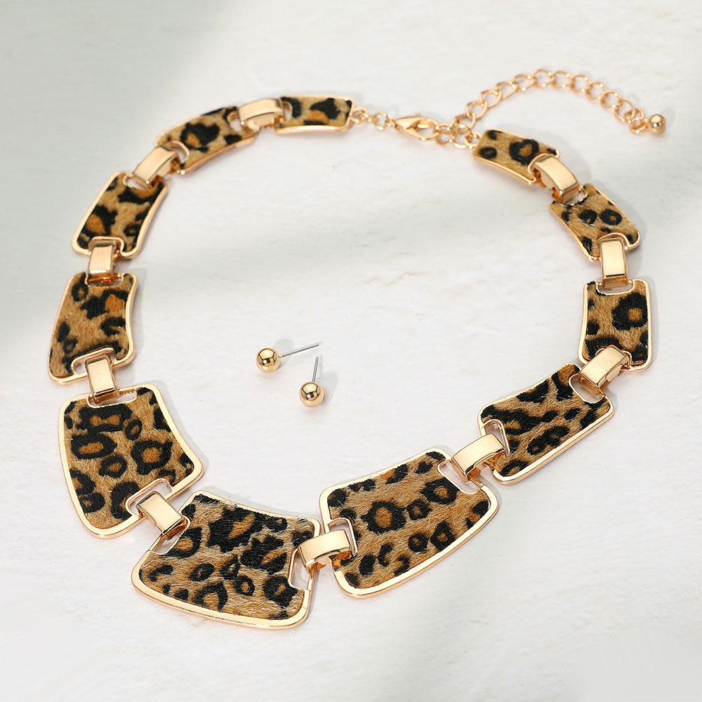 Details • Necklace Size : 17" + 3" L • Decor Size : 1.25" L • Earrings Size : 0.25" L • Make a bold impression with this statement necklace featuring wide linked panels in a striking leopard pattern. Designed to elevate any outfit, it comes with matching stud earrings for a complete look. Perfect for parties, evening events, or adding a dramatic edge to everyday style. • Lead and Nickel Compliant