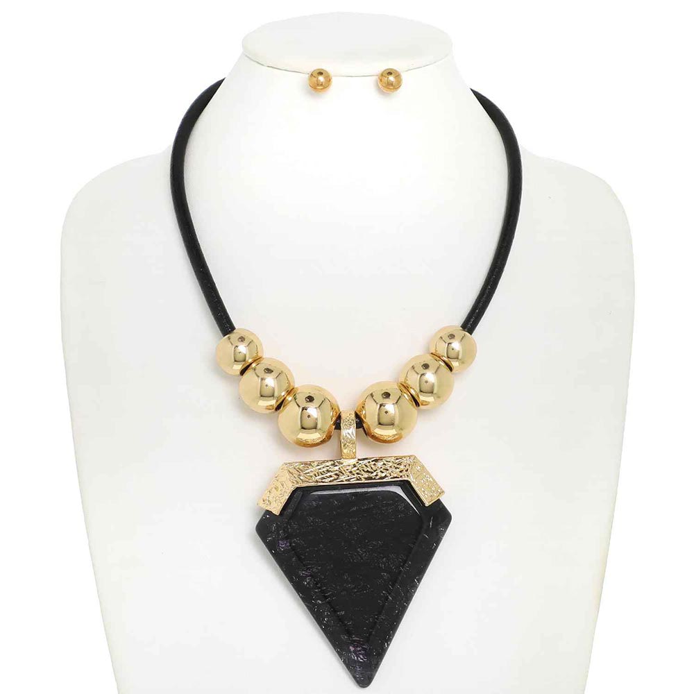 • Turn heads with the Geometric Statement Necklace Set, featuring a striking triangular pendant and polished gold accents. Paired with matching stud earrings, this bold design adds a touch of modern elegance, perfect for elevating evening wear or enhancing any standout look.