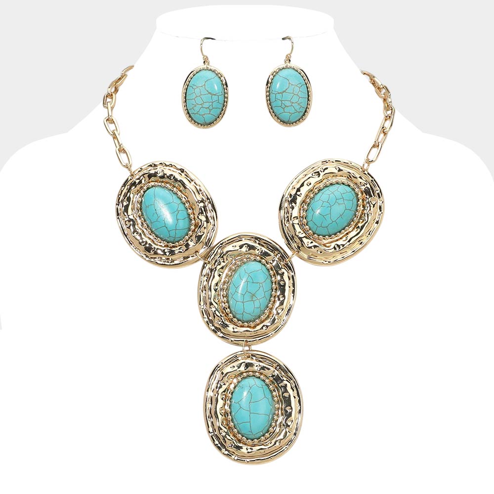 Details • Necklace Size : 18" + 3.25" L • Decor Size : 4.1" L • Earrings Size : 1.7" L • Statement necklace and matching earring set featuring bold oval accents with a textured, dimensional design. This coordinated jewelry set delivers a striking focal point for dressy occasions and elevated everyday looks. Ideal for boutiques seeking eye-catching statement pieces that offer balance, structure, and modern appeal while pairing easily with a variety of outfits and styling themes. • Lead and Nickel Compliant