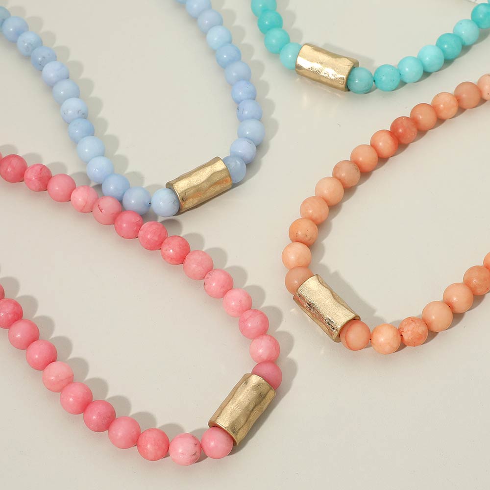 • This classic beaded accent necklace features evenly spaced round beads with a sleek focal detail for a clean, modern look. Designed for effortless styling, it layers easily with other necklaces or stands alone as a simple statement. Ideal for boutiques seeking versatile accessories that transition seamlessly from casual wear to polished outfits while offering timeless appeal and everyday wearability.