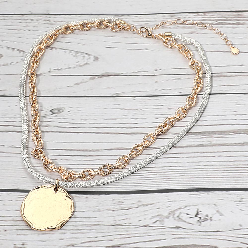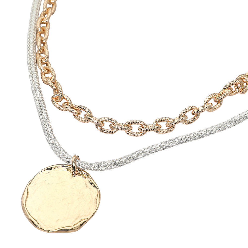 Details • Necklace Size : 14.5" + 3.25" L • Decor Size : 1.5" L • Pendant Size : 1.1" X 1.2" • This layered chain necklace features a textured coin pendant that adds modern charm and everyday elegance. Designed to layer easily or wear solo, it suits casual outfits, elevated looks, gifting displays, and boutique assortments seeking timeless, versatile statement jewelry. • Lead and Nickel Compliant