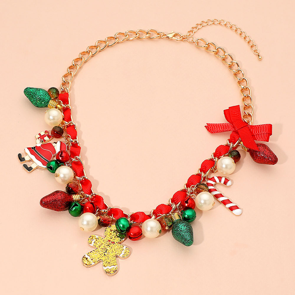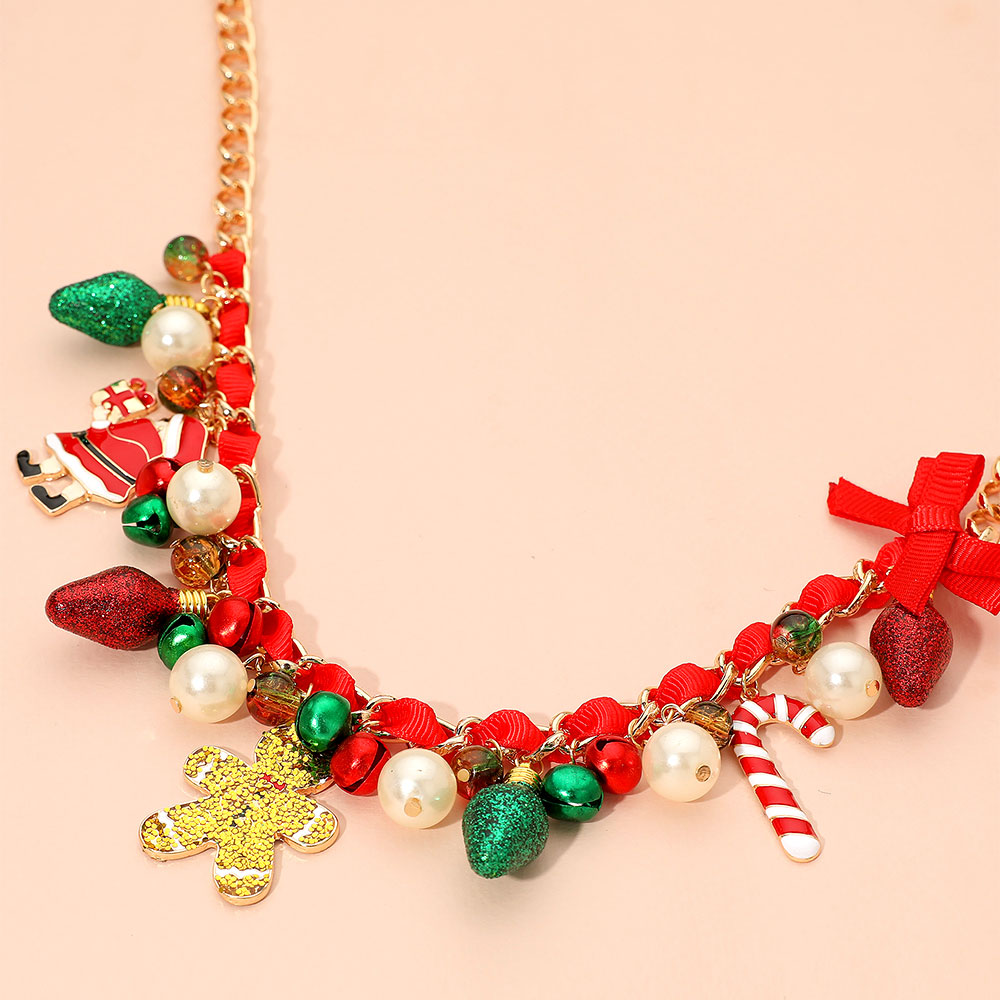 Holiday Santa Gingerbread Man Candy Cane Pearl Bow Charm Beaded Necklace
