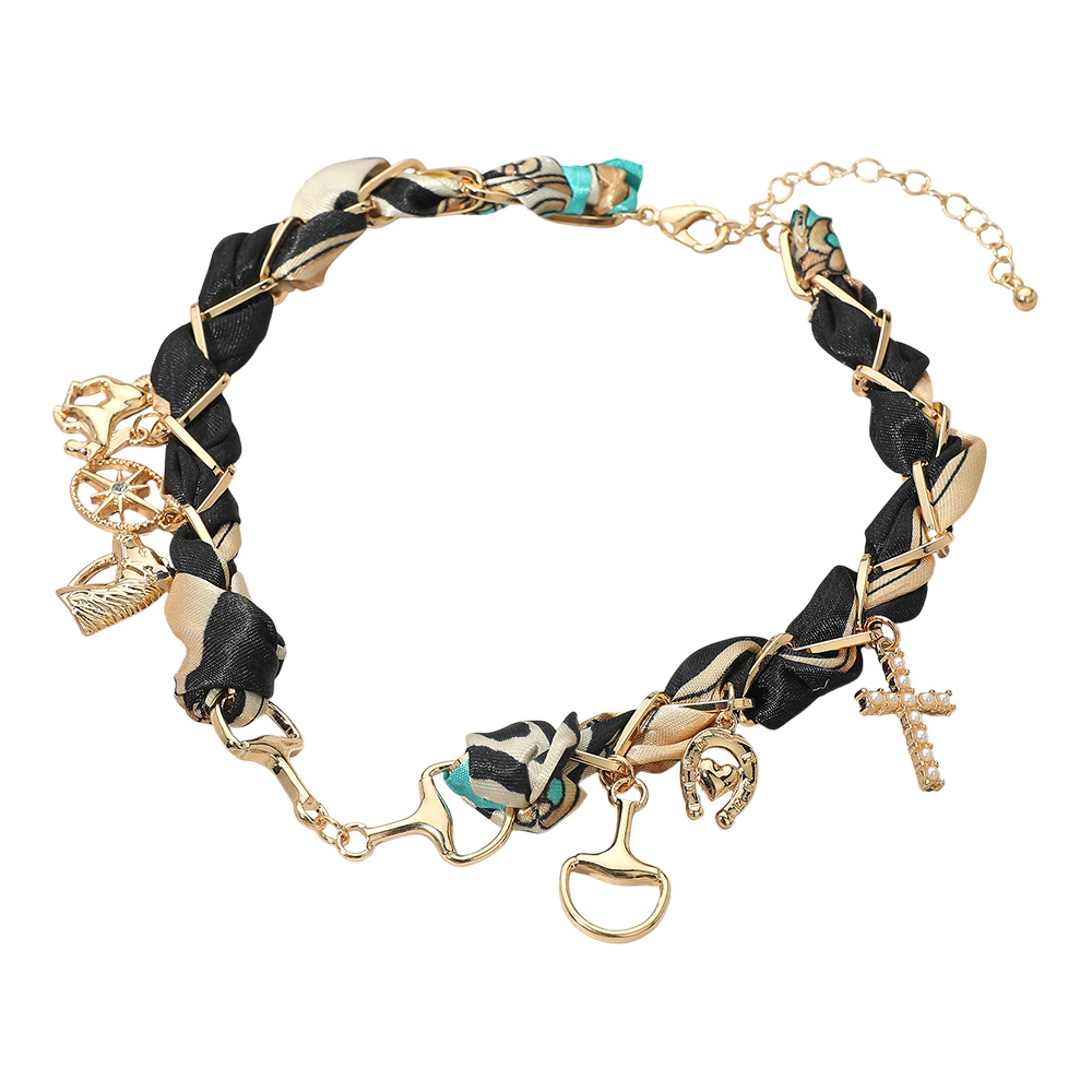 Horsebit Link Center Horse Horseshoe Pearl Cross Starburst Charm Station Fabric Necklace