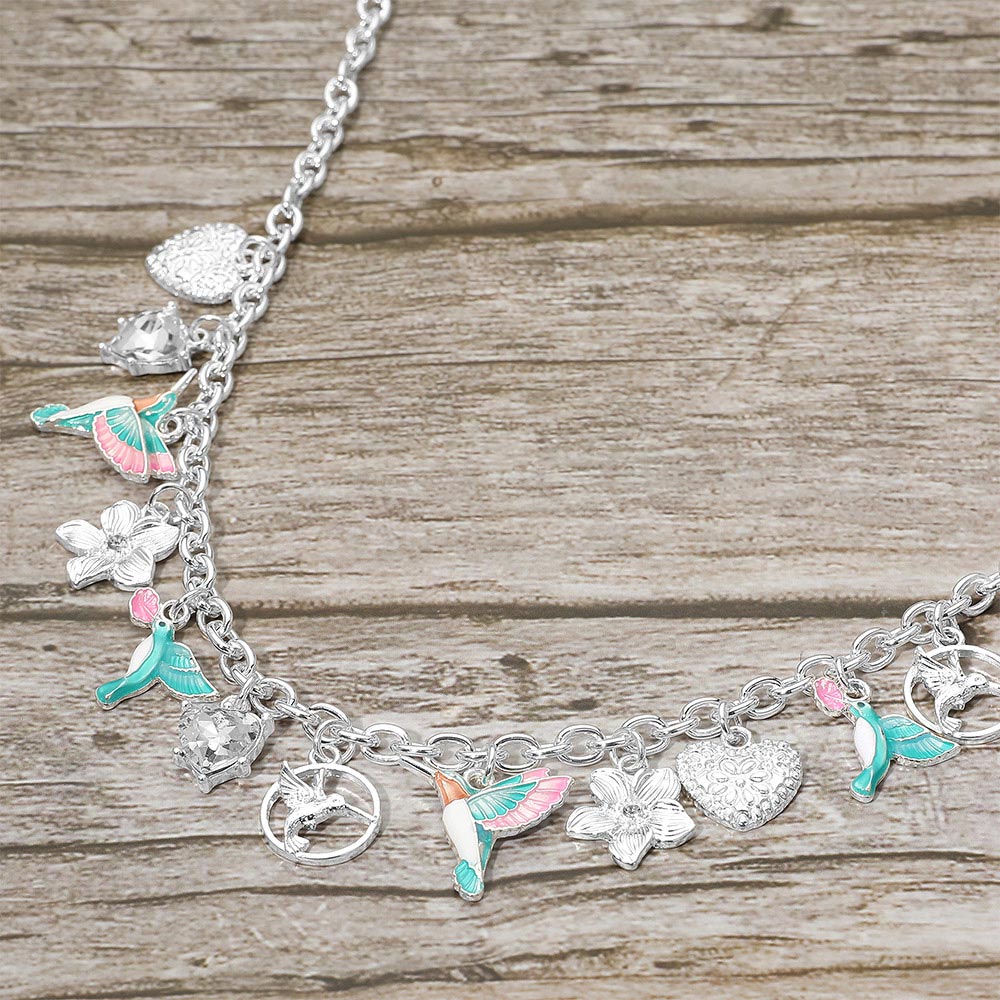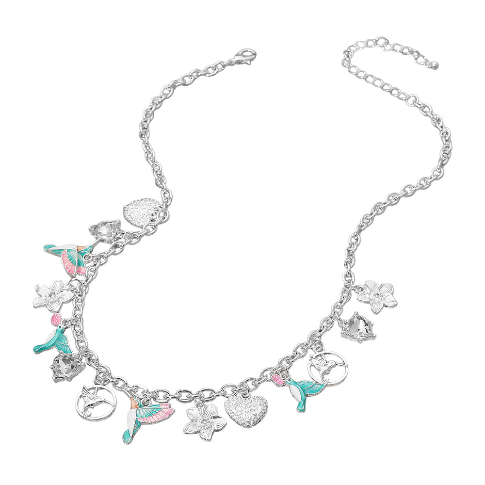 Details • Necklace Size : 18" + 3" L • Decor Size : 1" L • Delicate and eye-catching, this charm necklace features hummingbird and floral accents with heart details, creating a whimsical accessory full of movement and charm. Perfect for adding a playful, nature-inspired touch to both casual and dressy outfits. • Lead and Nickel Compliant