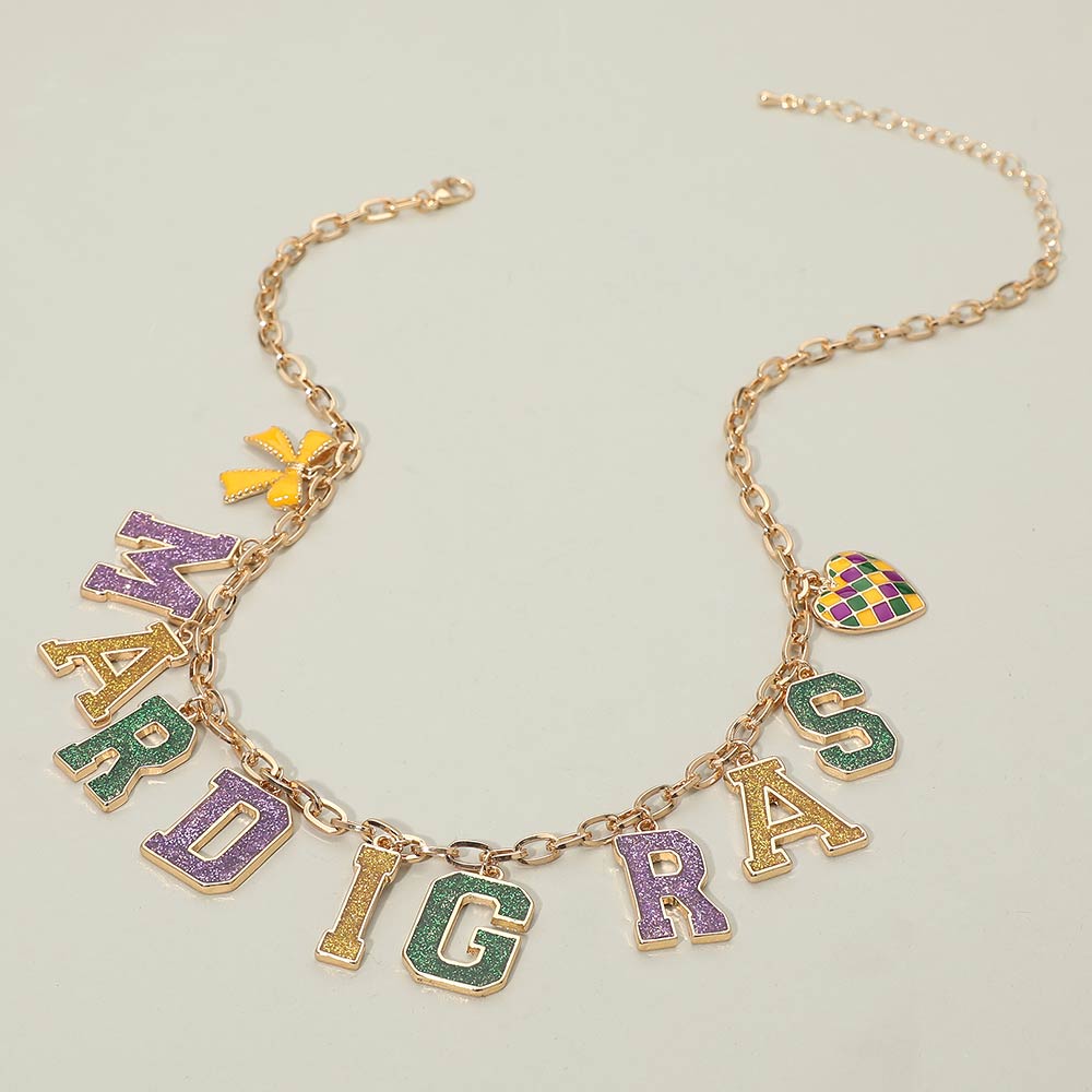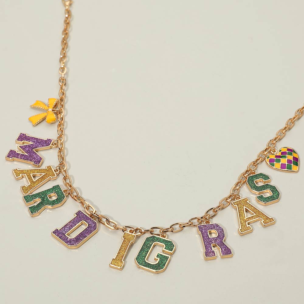 MARDI GRAS Letter Bow Heart Charm Station Necklace MARDI GRAS Letter Bow Heart Charm Station Necklace MARDI GRAS Letter Bow Heart Charm Station Necklace