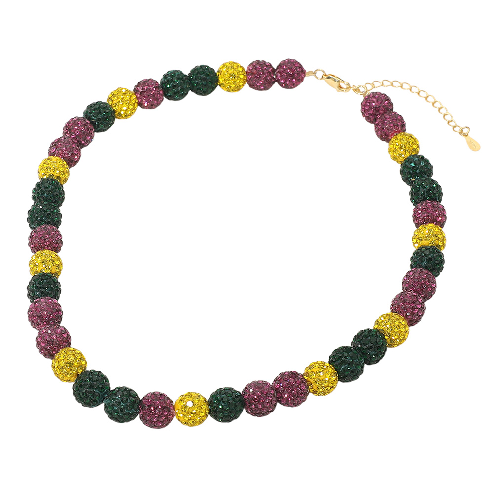 Details • Necklace Size : 15.5" + 2.25" L • Decor Size : 0.4" L • Festive beaded necklace featuring evenly spaced faceted beads with a high-shine, light-catching finish. Designed with a smooth strand layout and completed with an adjustable chain for a flexible fit. Ideal for Mardi Gras celebrations, parades, themed events, party outfits, and boutique seasonal assortments. Adds bold sparkle and statement appeal to any festive look. • Lead and Nickel Compliant