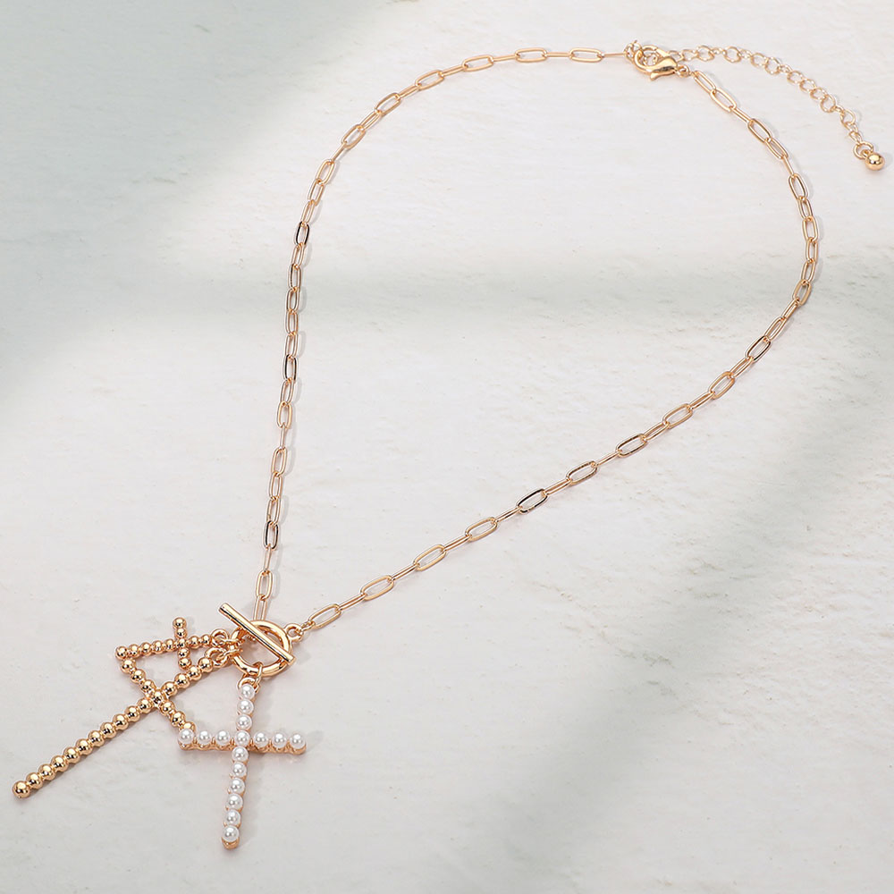 Metal Bubble Pearl Cross Charm Pendant Necklace