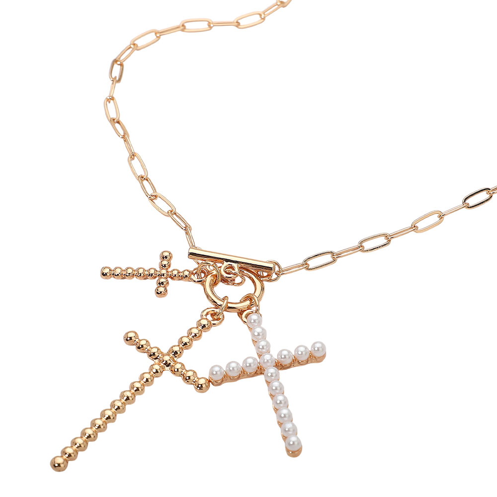 • Stylish triple cross pendant necklace featuring a chunky link chain with bead and pearl-accented crosses. Its layered, faith-inspired design blends elegance and modern edge, making it a perfect statement accessory for casual, dressy, or spiritual looks.
