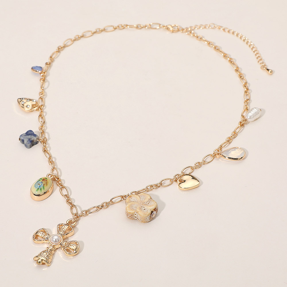• This mixed charm chain necklace showcases a stunning collection of pendants, including hearts, a bow, and floral motifs. With its balanced blend of elegance and playful charm, it adds a touch of sophistication and individuality to any look, perfect for layering or everyday wear.