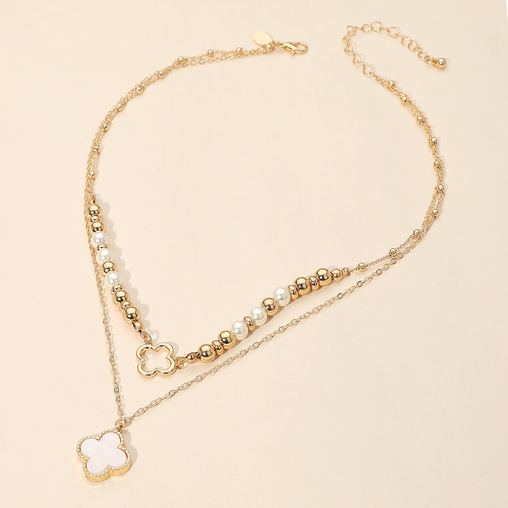 Details • Necklace Size : 16" + 3" L • Decor Size : 3" L • Pendant Size : 0.7" X 0.7" • Elegant layered necklace featuring beaded details and dual quatrefoil pendants for a refined, on-trend look. Designed to style beautifully alone or with other chains, it adds subtle charm to everyday outfits, evening ensembles, or thoughtful gift selections for any occasion. • Lead and Nickel Compliant