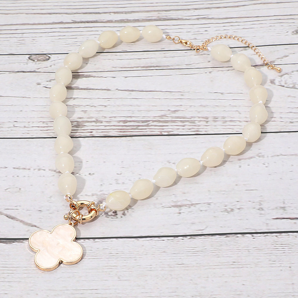 Details • Necklace Size : 16.5" + 3.5" L • Decor Size : 2" L • Charming beaded necklace featuring smooth round beads and a mother of pearl quatrefoil-shaped pendant for a refined, stylish look. Perfect for casual or dressy outfits, adding a touch of sophistication and personality. A versatile accessory that blends modern elegance with timeless appeal. • Lead and Nickel Compliant