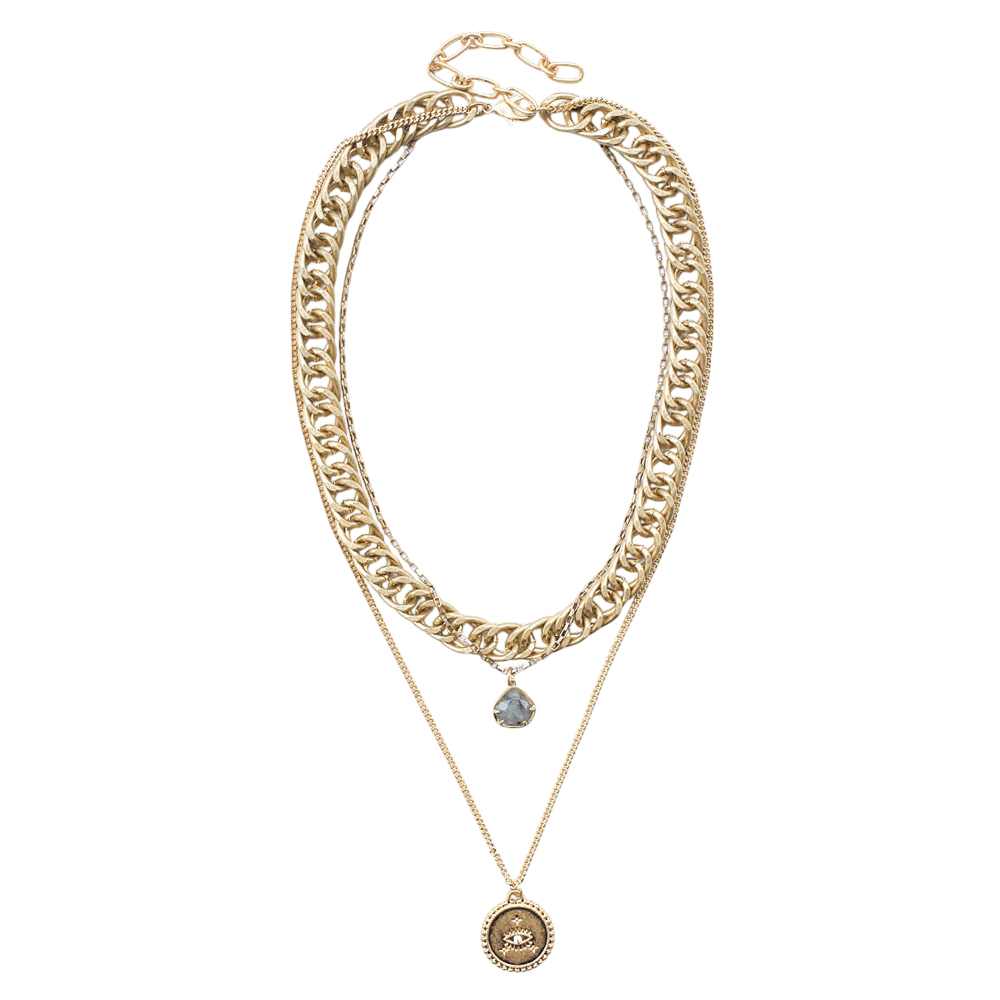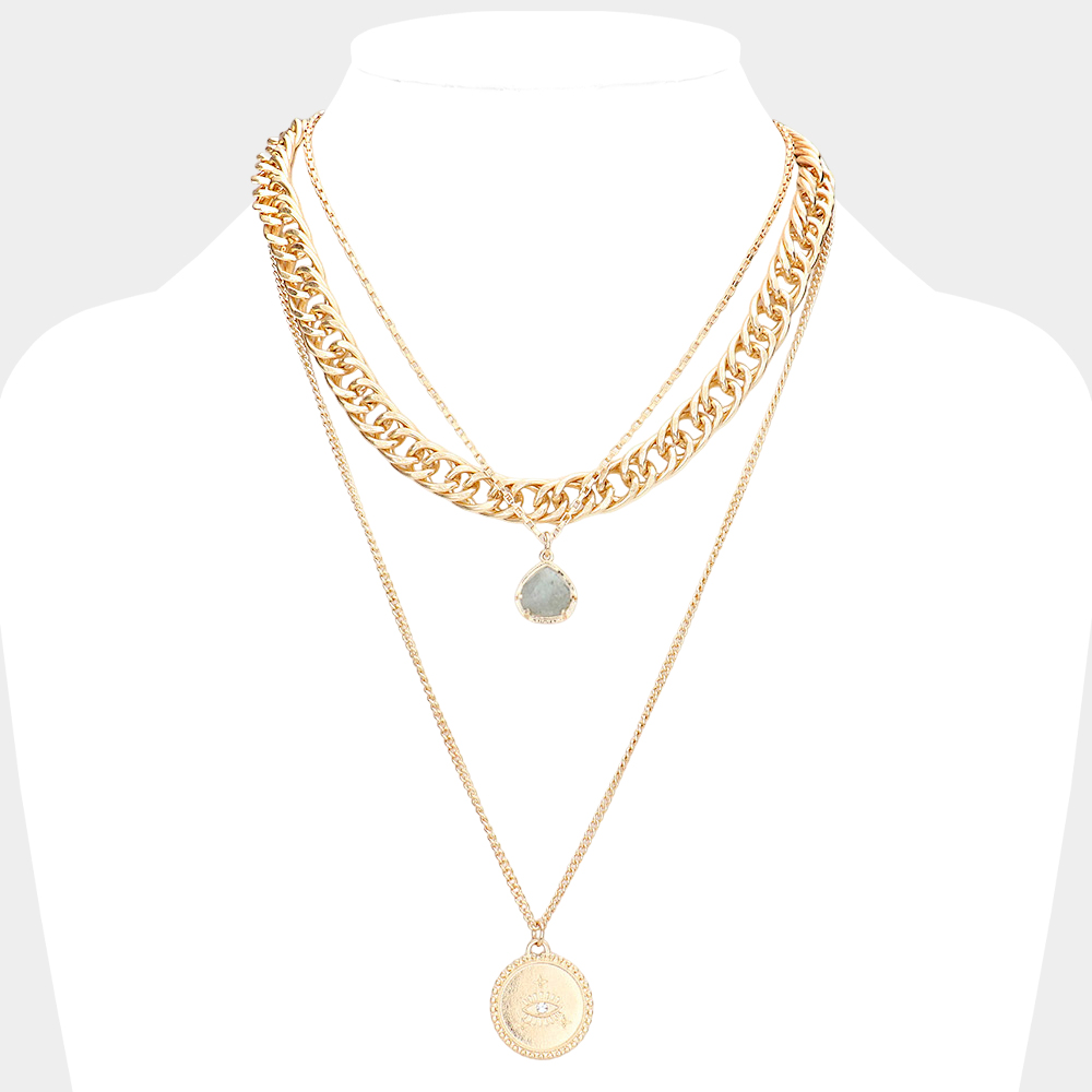 Natural Stone Evil Eye Detailed Metal Round Pendant Triple Layered Necklace