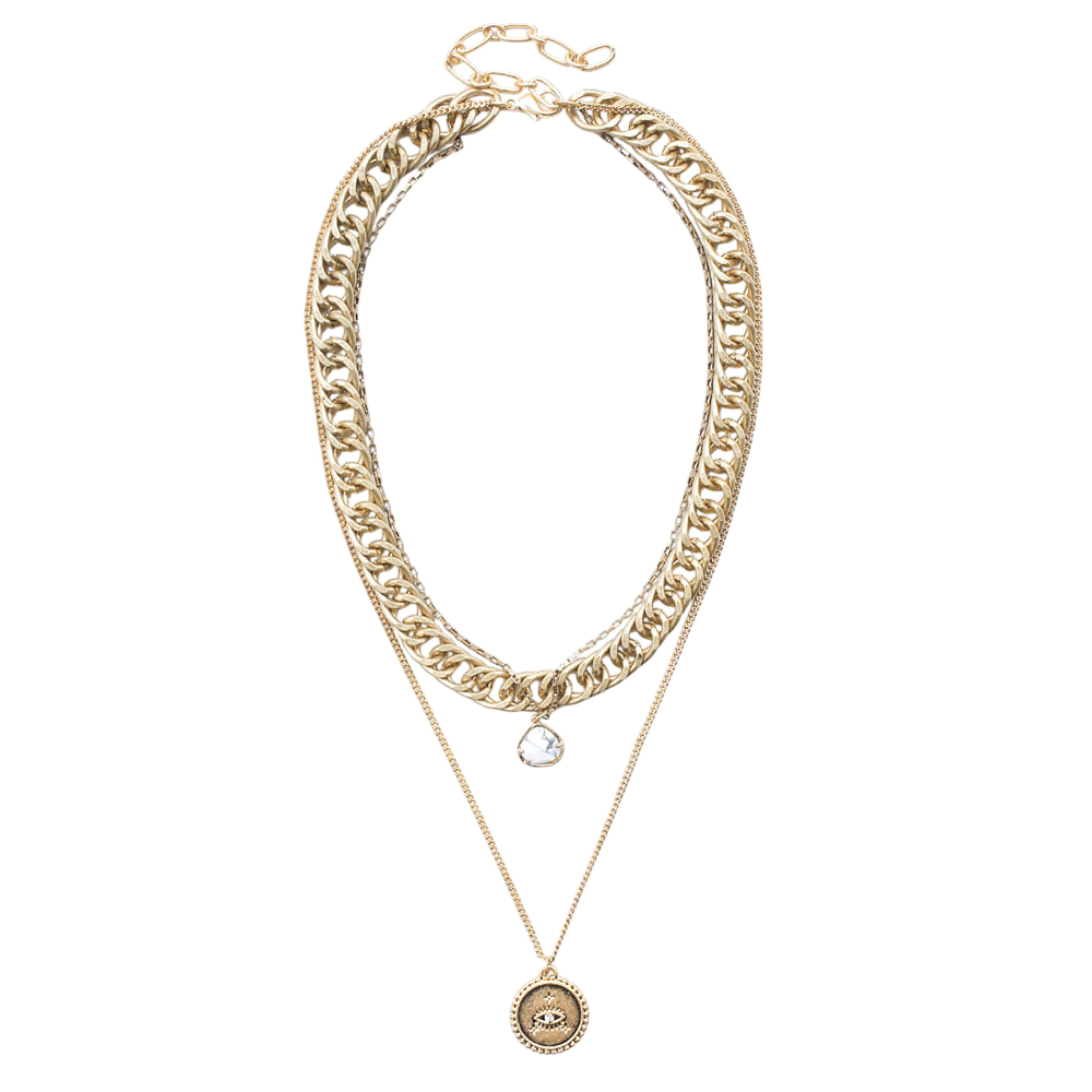 Natural Stone Evil Eye Detailed Metal Round Pendant Triple Layered Necklace