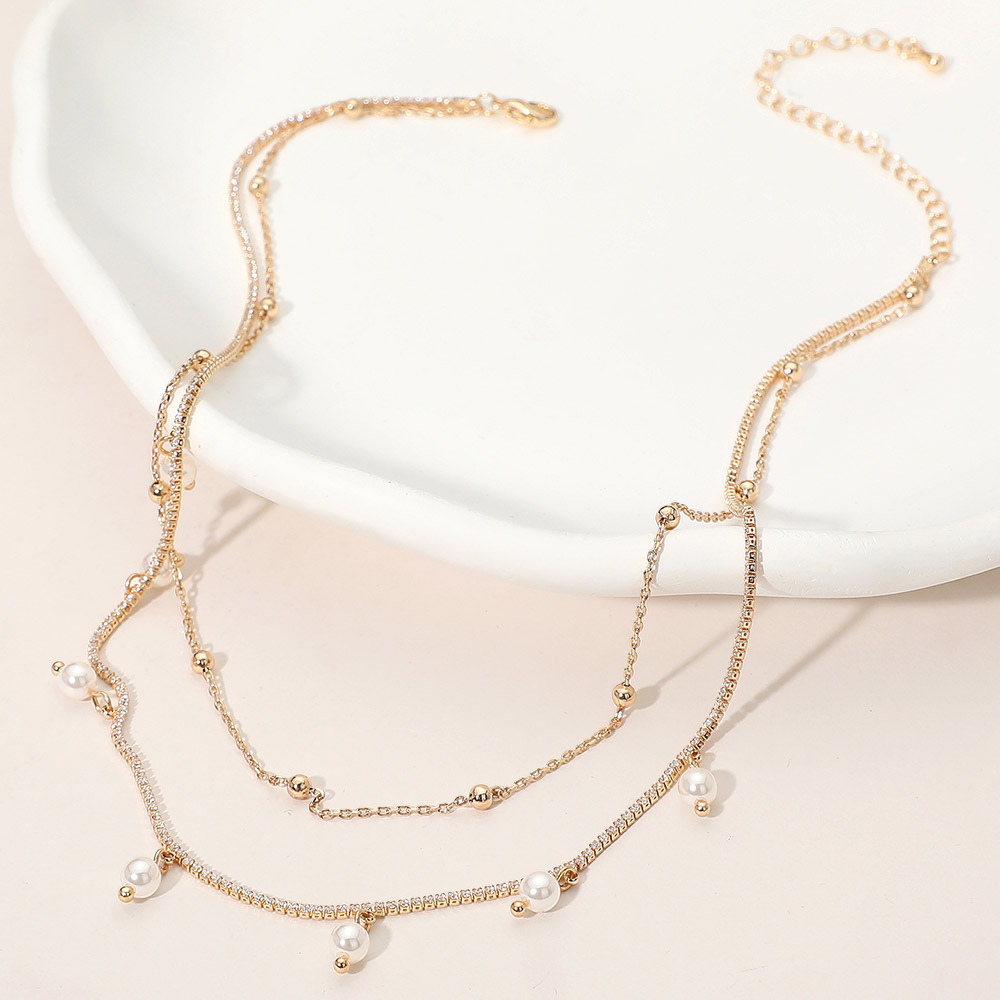 • This layered chain necklace features a refined mix of delicate beads and lustrous pearl-like accents for a graceful, feminine touch. Its versatile layered design complements any neckline, making it ideal for everyday wear or adding understated elegance to special occasions.