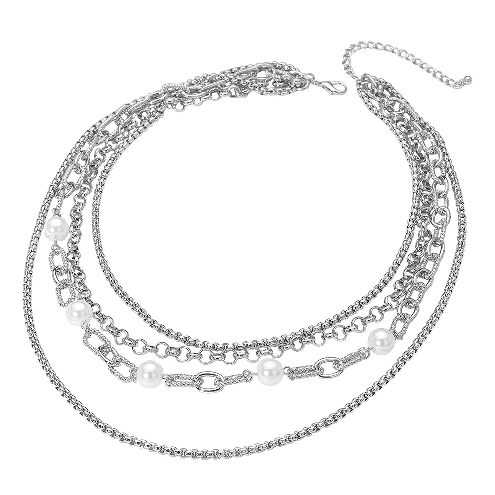 Details • Necklace Size : 18" + 3.5" L • Decor Size : 3" L • Elegant layered chain necklace featuring multiple link styles and delicate pearl bead accents. This chic multi-strand piece adds texture and sophistication, making it a perfect accessory for elevating casual looks or complementing formal outfits with timeless appeal. • Lead and Nickel Compliant