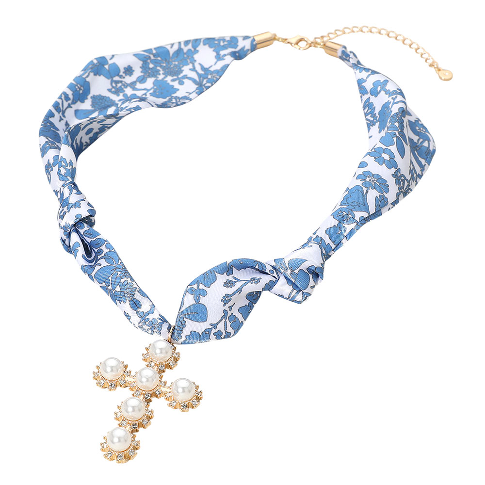 Details • Necklace Size : 18.5" + 3.5" L • Pendant Size : 1.5" X 2.5" • Print may vary • Make a bold style statement with the Scarf Necklace with Cross Charm, combining a soft scarf-style band with an eye-catching pendant design. Perfect for casual or dressy outfits, this accessory adds texture, movement, and standout appeal to any look. • Lead and Nickel Compliant