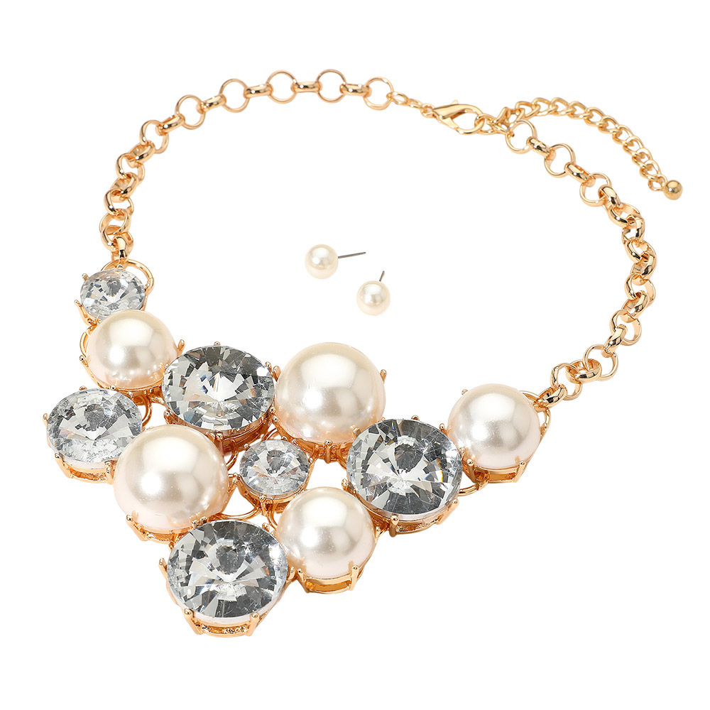 Details • Necklace Size : 19" + 3" L • Decor Size : 3.5" L • Earrings Size : 0.4" L • This elegant statement necklace features lustrous pearl-like accents paired with shimmering gemstones for a radiant finish. Complete with matching stud earrings, it offers a perfect blend of sophistication and glamour, ideal for weddings, galas, or upscale evening looks. • Lead and Nickel Compliant